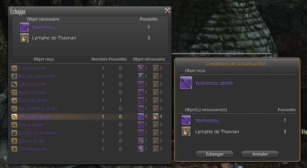 Pour obtenir votre arme Zénithéenne, il n’y a rien de plus de simple. Il vous suffira de vous rendre à Mor Dhona et d’acheter trois Lymphes de Thavnair auprès d’Auriana pour 150 mémoquartz allagois martiaux l’unité (catégorie martiaux > autres)