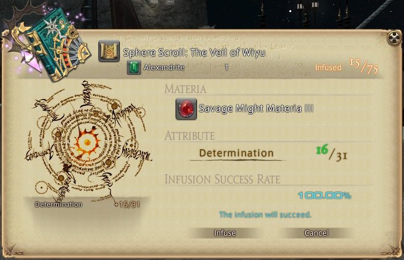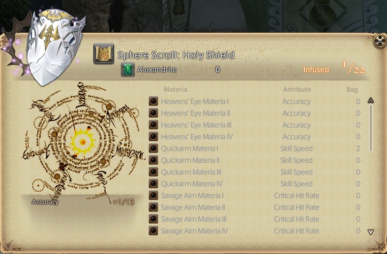 Ce parchemin servira de réceptacle à Matéria que vous devrez fixer à l’aide d’Alexandrites, le choix des Matéria vous revient mais vous n’avez le droit qu’à 75 points de statistique au total. Chaque Matéria fixée équivaut à un point dans la statistique choisie (même celles de rang supérieur), votre tâche consistera donc à rassembler 75 Alexandrites et des Matéria.