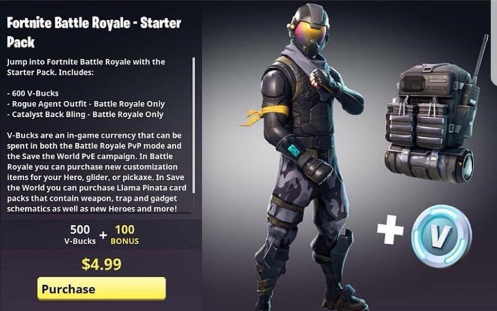 Le Starter Pack vendu à 5€ contient un skin exclusif « Rogue Agent » (avec son sac à dos), 500 V-Bucks, plus un bonus de 100 par rapport à sa valeur (à croire que le V-Buck ait un cours).