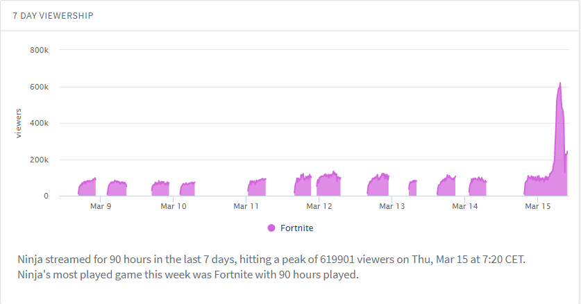 Pour ceux qui ne connaissent pas Ninja, il s’agit du streameur le plus en vogue en ce moment. Il combine la vague de succès de Fortnite avec une personnalité explosive (et une bonne dose de skill) pour atteindre une moyenne de près de 100 000 spectateurs sur ces dernières semaines, ce qui est tout bonnement hallucinant.
