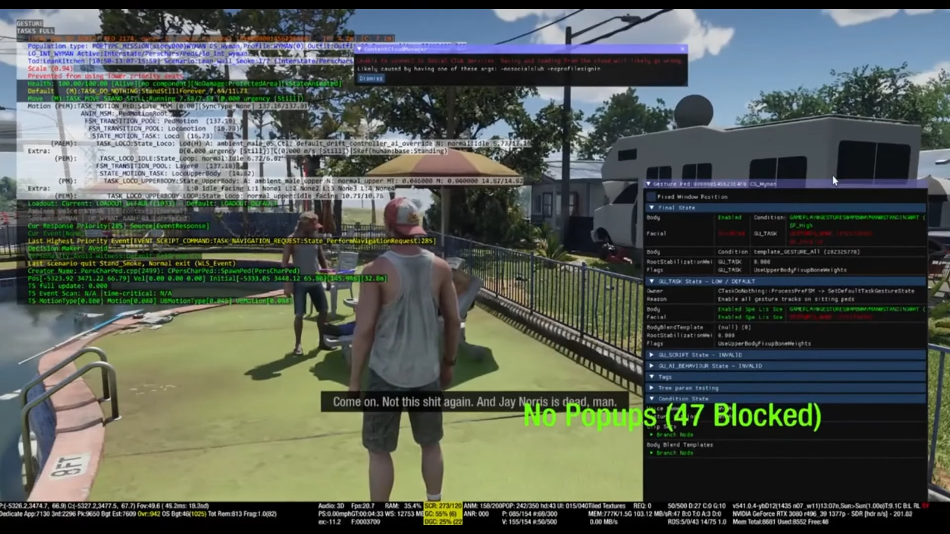 Sans surprise, la plupart des vidéos ont été enregistrées sur un jeu activement en développement et dateraient de 2019, et ne représentent en aucun cas la qualité du jeu final… dont la sortie pourrait encore se compter facilement en année. Certaines des vidéos ne durent que quelques secondes et servent clairement de matériel de débuggage pour les développeurs de Rockstar, comme les nombreuses consoles et interfaces de développement le laissent penser.