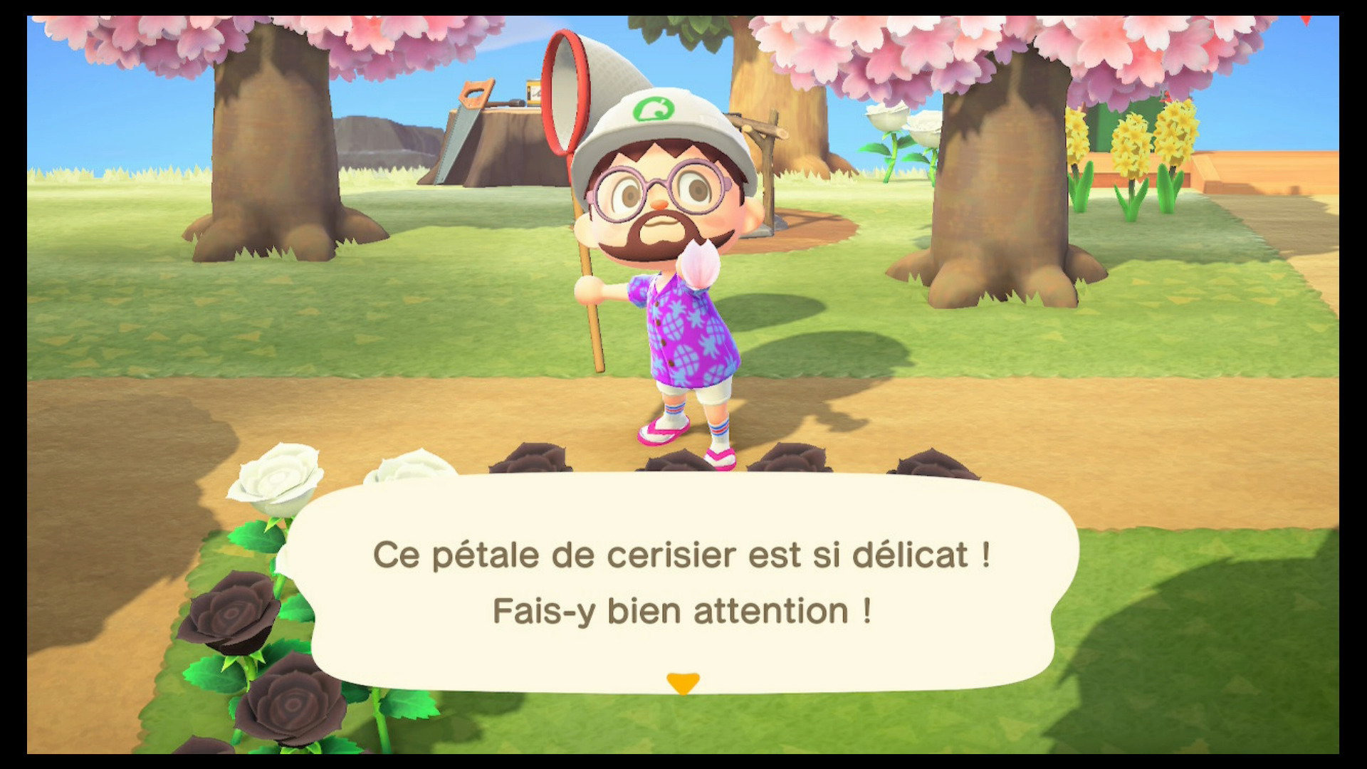 En effet, jusqu’au 10 avril, la plupart des arbres de votre île sont en fleur, teintés d’une belle couleur rose violacé. De temps en temps, des pétales tomberont, emportés par le vent… et il est conseillé de les attraper. Pour ce faire, utilisez votre filet. Faites vite avant qu’elles ne touchent le sol !