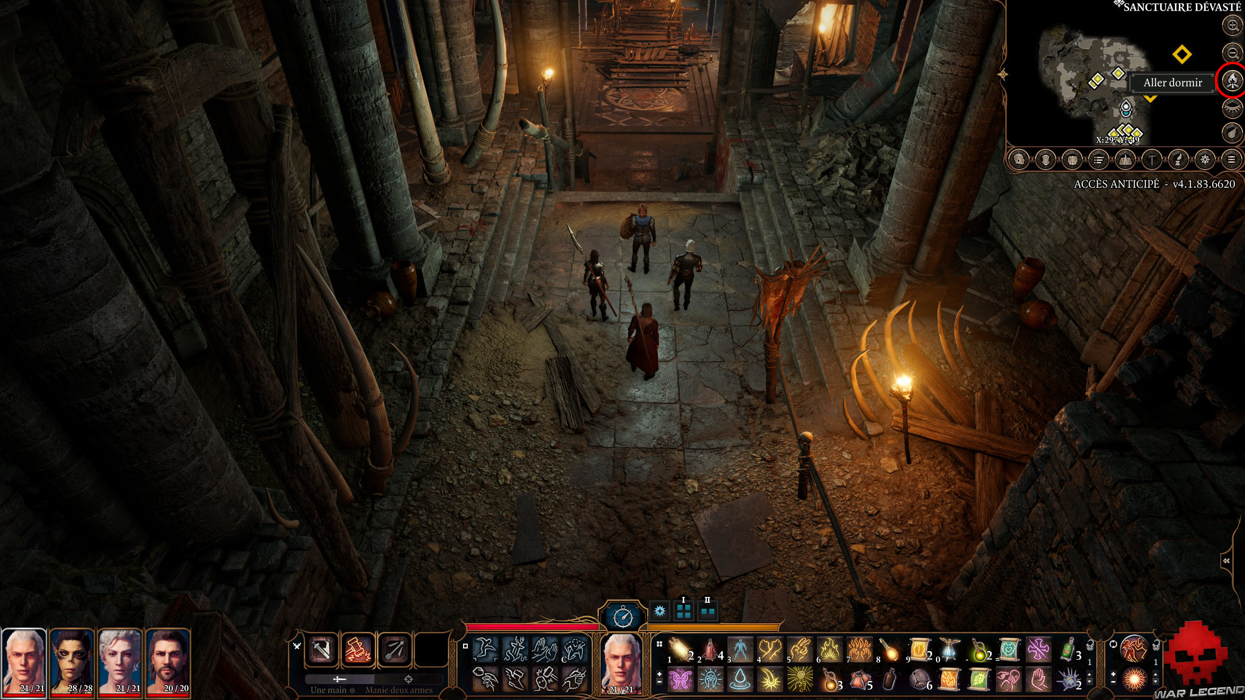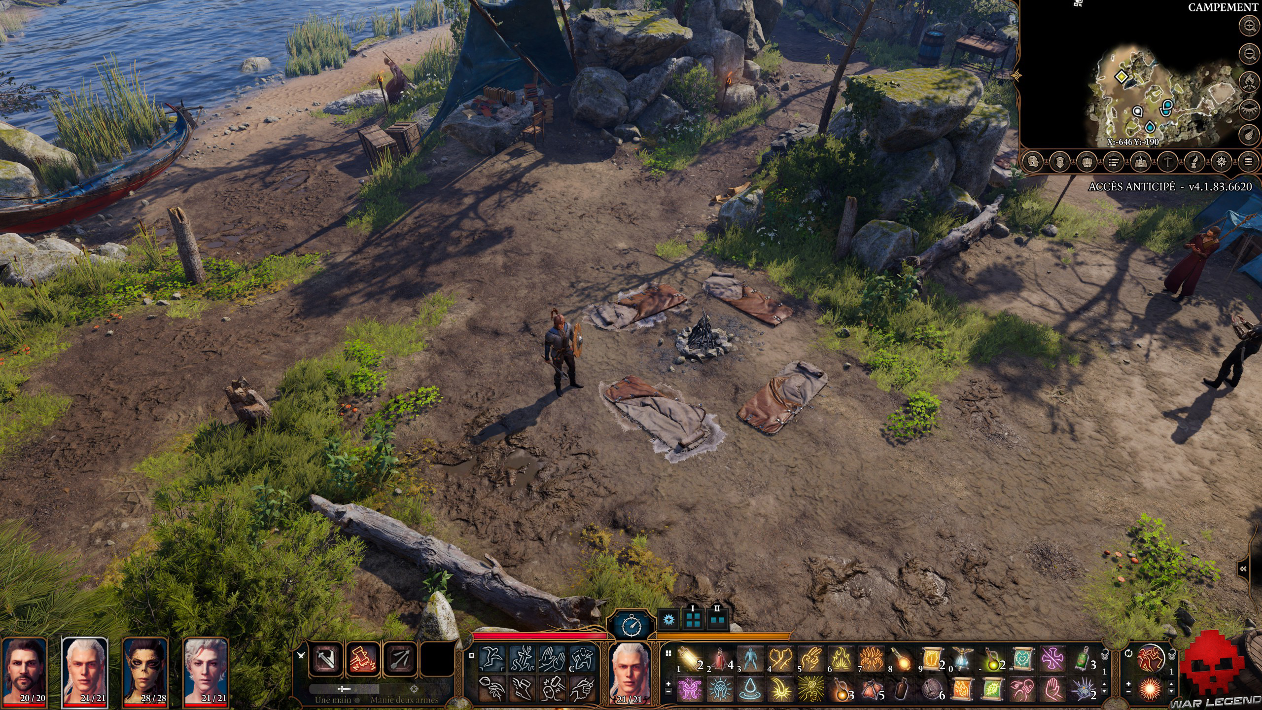 Le repos long se déroule impérativement au camp. Sauf que le jeu vous y envoie au début en vous laissant cliquer sur le feu de camp pour terminer la journée. Si vous voulez retourner au camp plus tard, utilisez un point de passage (les cercles runiques violets que vous pouvez trouver sur les murs) et choisissez « Camp ».