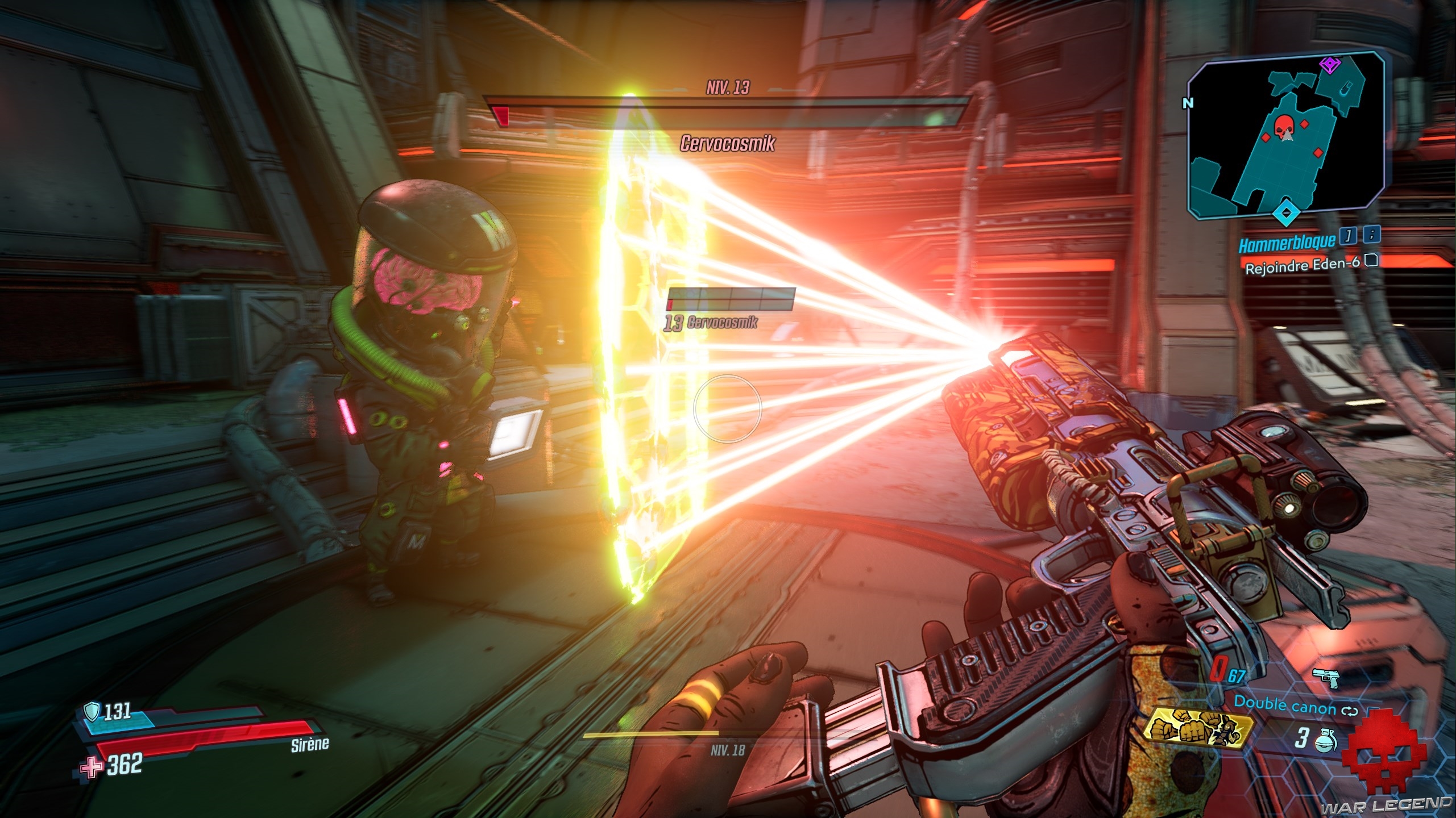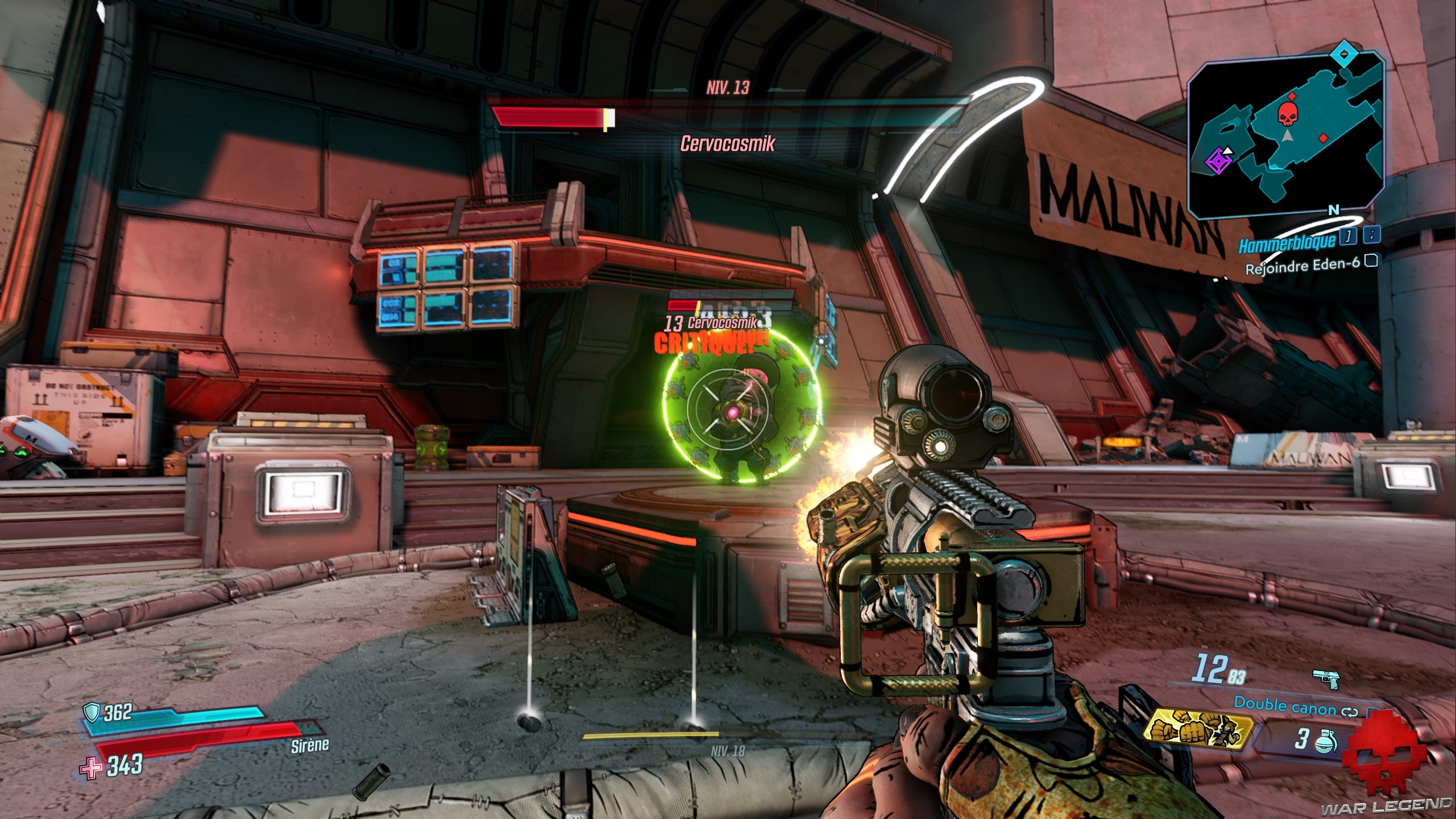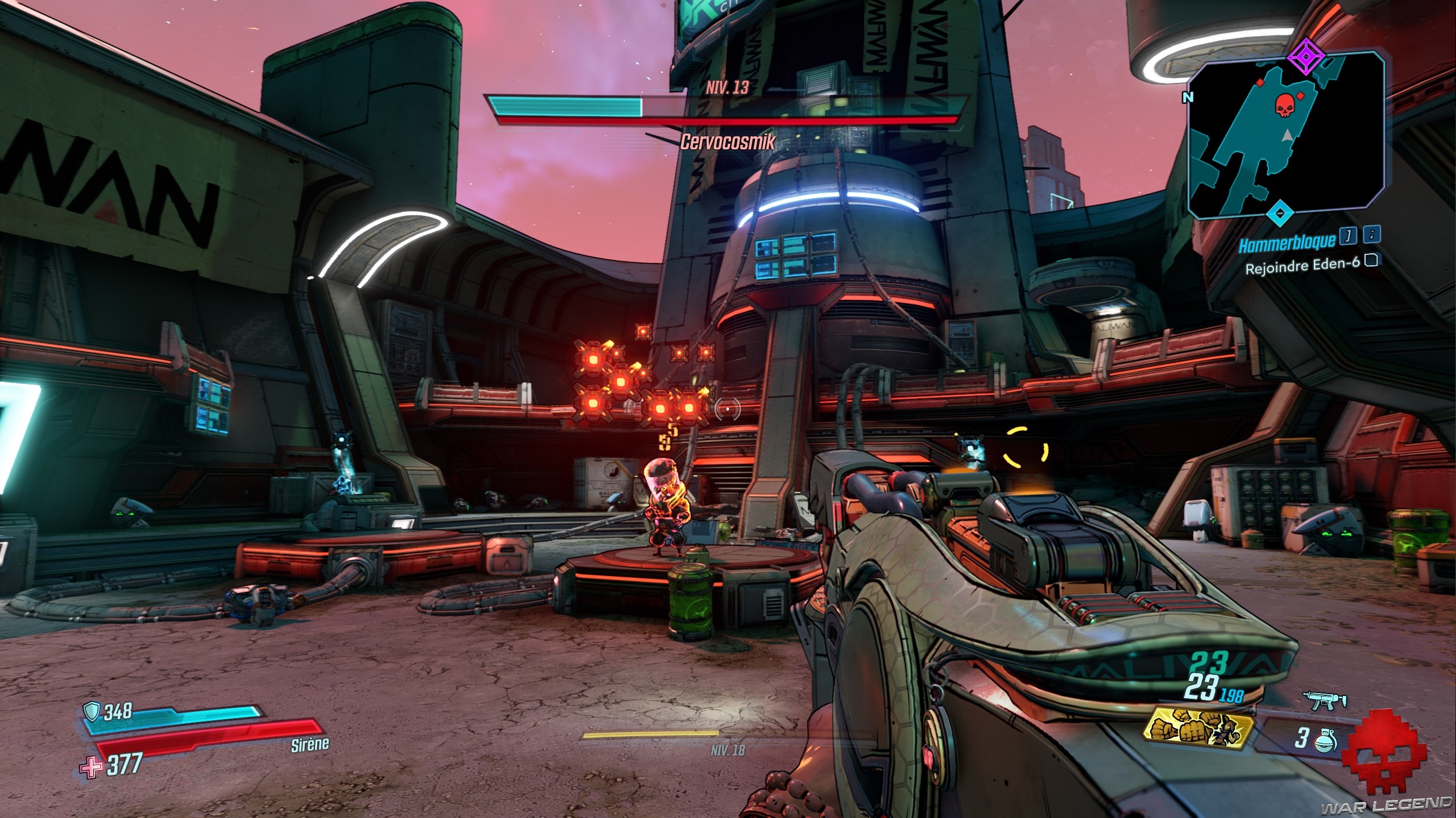 Des soldats de Maliwan sont également présents dans l’arène, mais ne gênent pas plus que ça. Pensez toutefois, si vous êtes mis à terre, à détruire les petits drones du boss qui orbitent autour des soldats et régénèrent leur bouclier constamment.