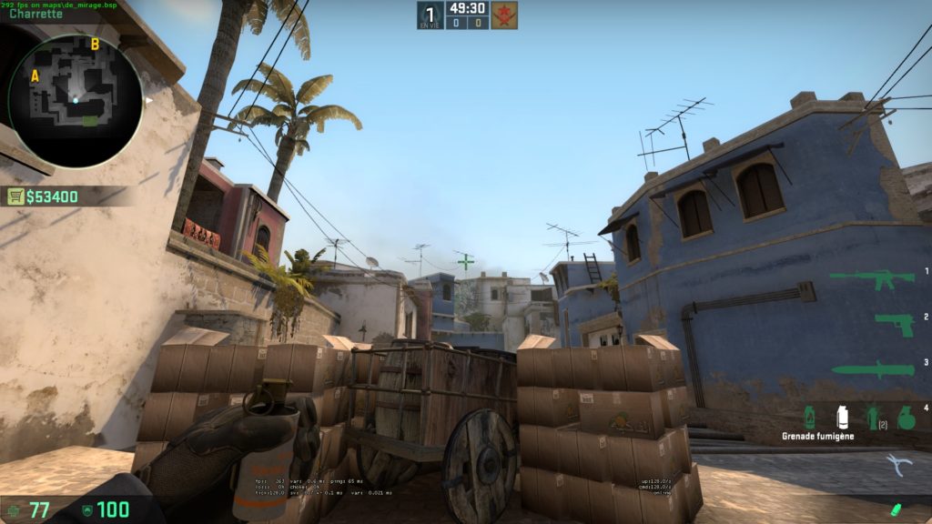 C’est pour cela qu’il faut absolument disputer, au moment opportun, cette partie de la carte. Ici, nous vous présenterons quatre smokes essentielles qui vous permettront de récupérer, au fil du round, des zones dans le Mid et ainsi pouvoir vous diriger en A ou B. Nous procéderons toujours de la même manière : une courte vidéo afin de vous montrer l’exécution de la smoke en question puis un screenshot de la position de départ pour vous permettre de la reproduire.