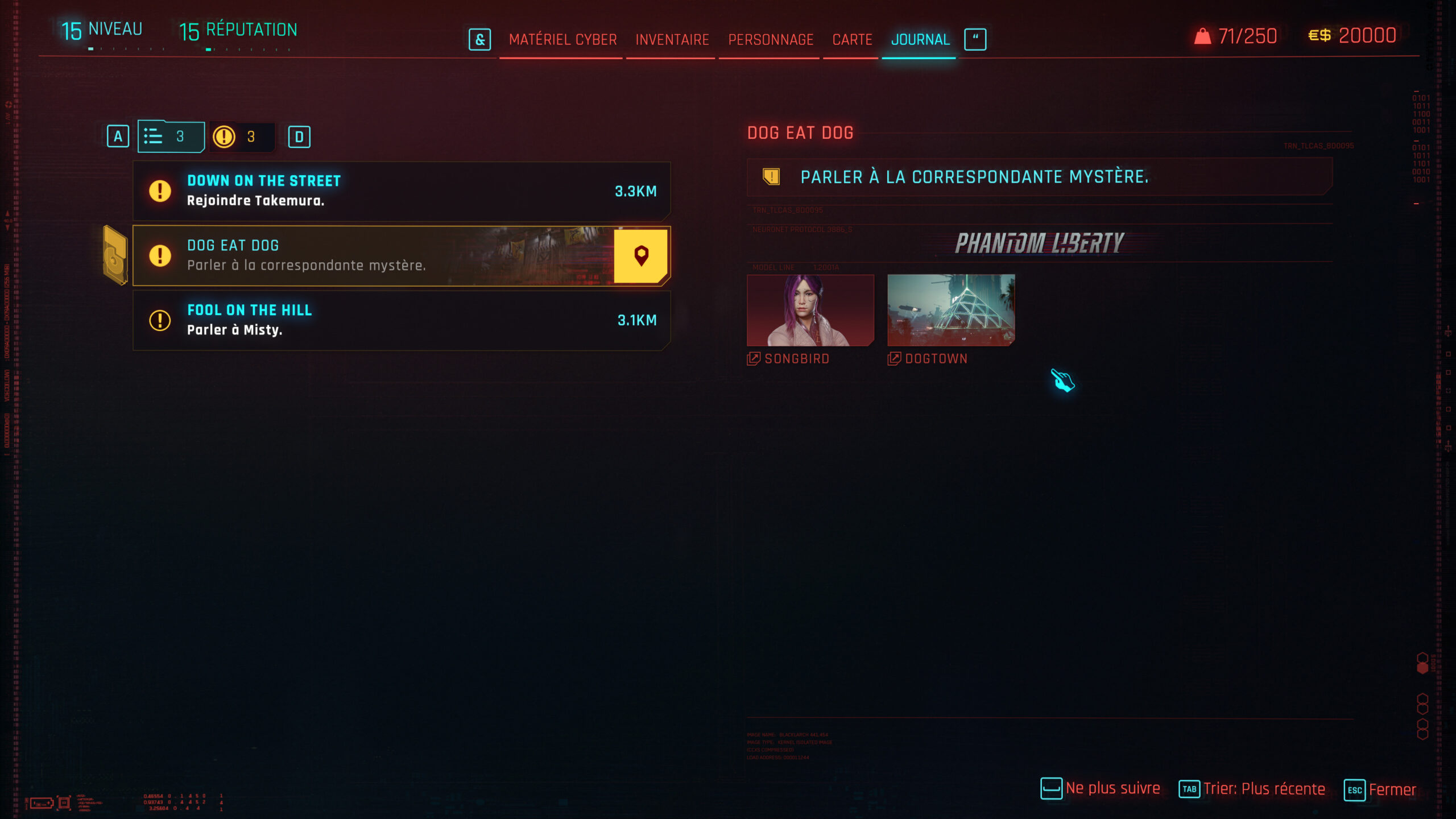 Après une brève discussion et avoir accepté l’étrange offre qui vous invite à vous rendre à Dogtown, le nouveau quartier de Night City proposé par l’extension, vous aurez alors accès à la mission « Dog Eat Dog », point d’entrée de l’arc narratif de Phantom Liberty.