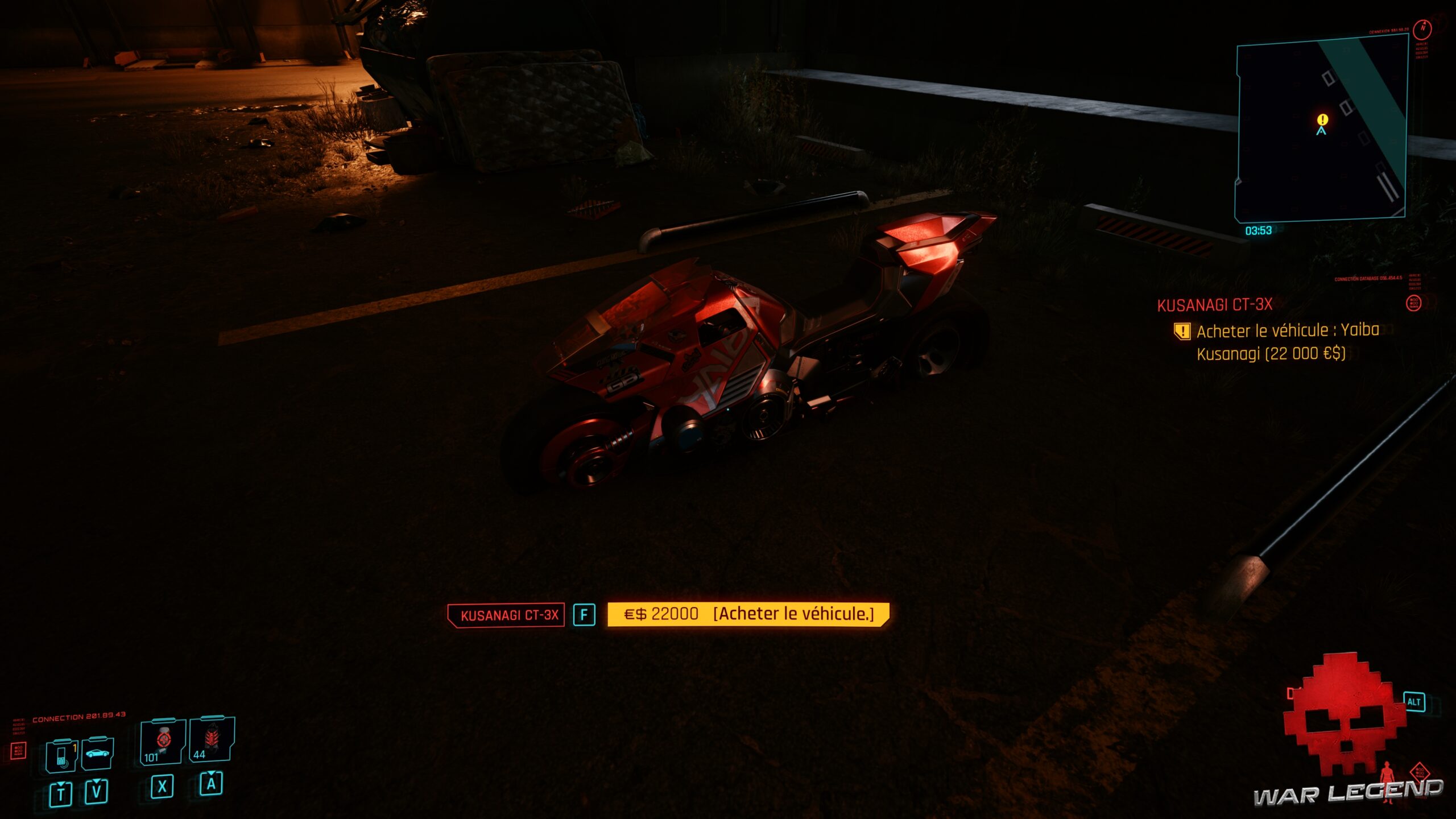 Dans Cyberpunk 2077, il est possible de collectionner toutes sortes de véhicules : voitures, camions, tout-terrains, motos, caisses à savon… À terme, vous pouvez acquérir la plupart des véhicules que vous apercevez dans les rues de Night City.