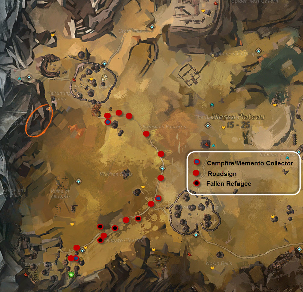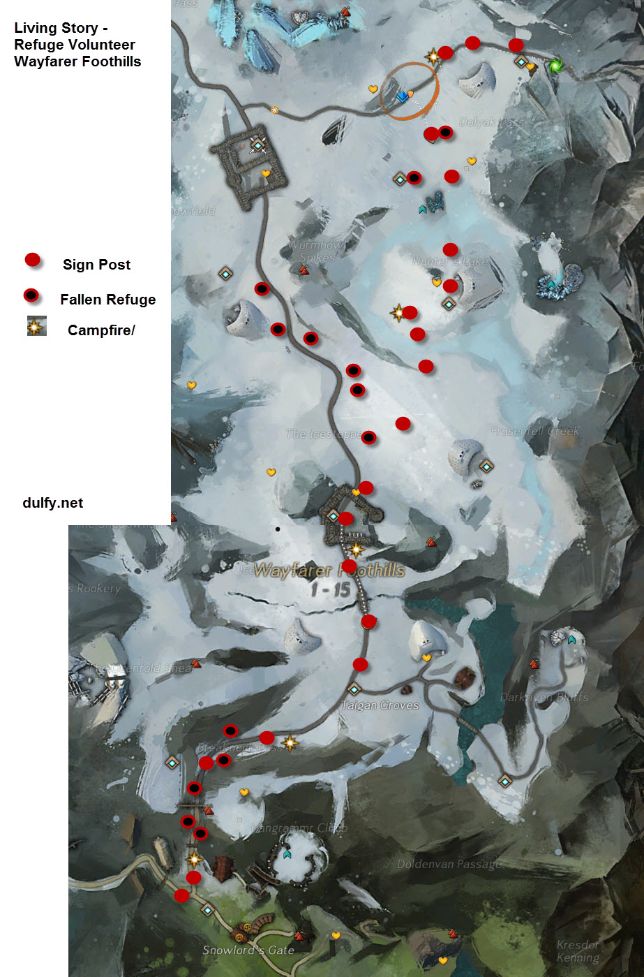 Comment démarrer l’aventure ? Il n’y a pas vraiment d’éléments déclencheurs. Des réfugiés voyageant de Contreforts du voyageur à Hoelbrak et du Plateau de Diessa à la Citadelle Noire ont besoin de votre aide. Apparaitrons sur votre carte des icônes vous permettant d’accomplir certaines tâches. Chaque action vous donnera 1 point d’assistance, il en faut 75 pour obtenir le titre de volontaire. N’hesitez pas a switcher entre zone de débordement et Monde normal pour vous assurer d’avoir plus facilement tous les évents.