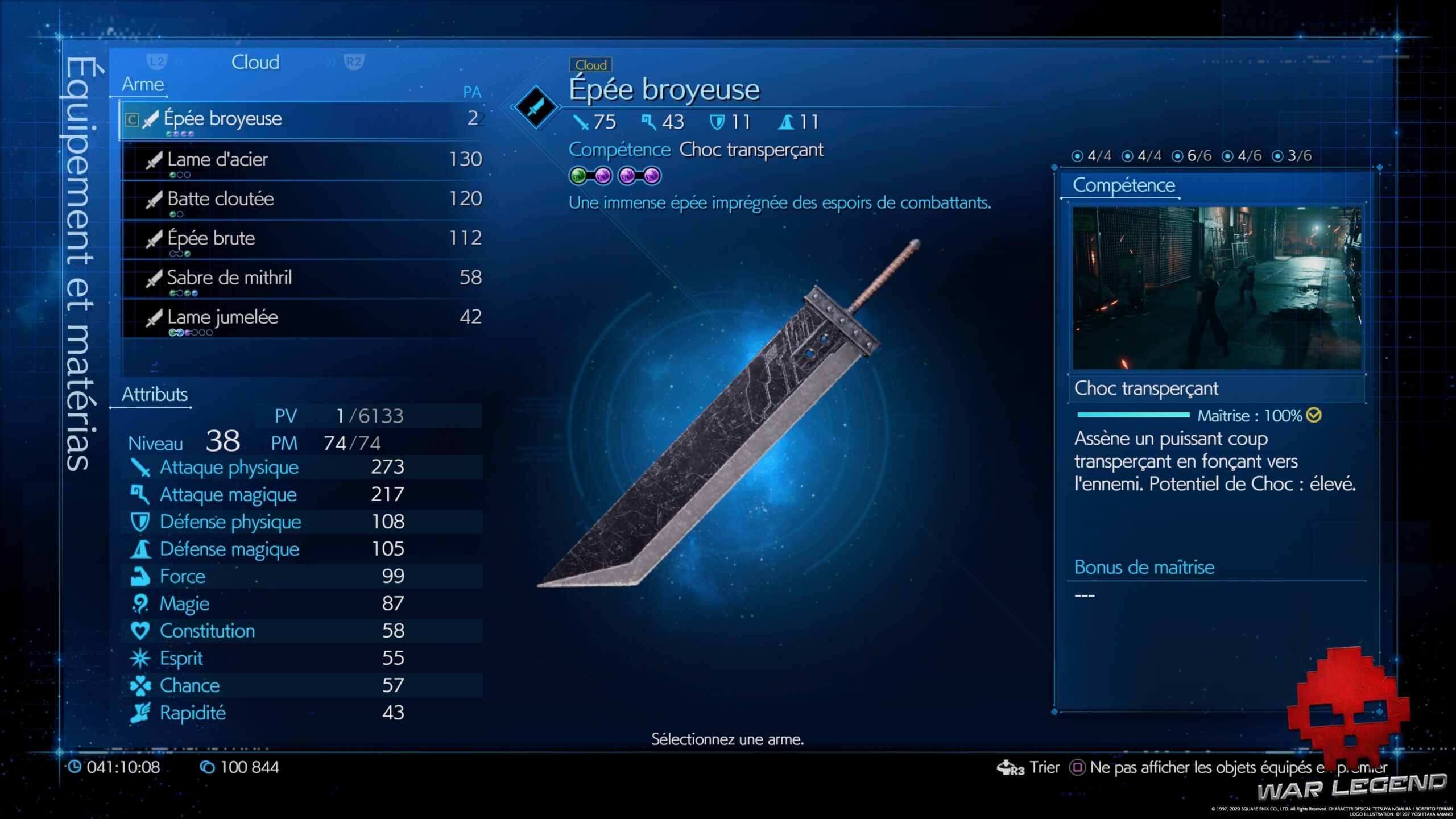 Cette épée offre les meilleurs bonus de dégâts physiques parmi l’arsenal de Cloud. La compétence Fin infinie est le finisher par excellence quand l’ennemi passe en état de Choc.