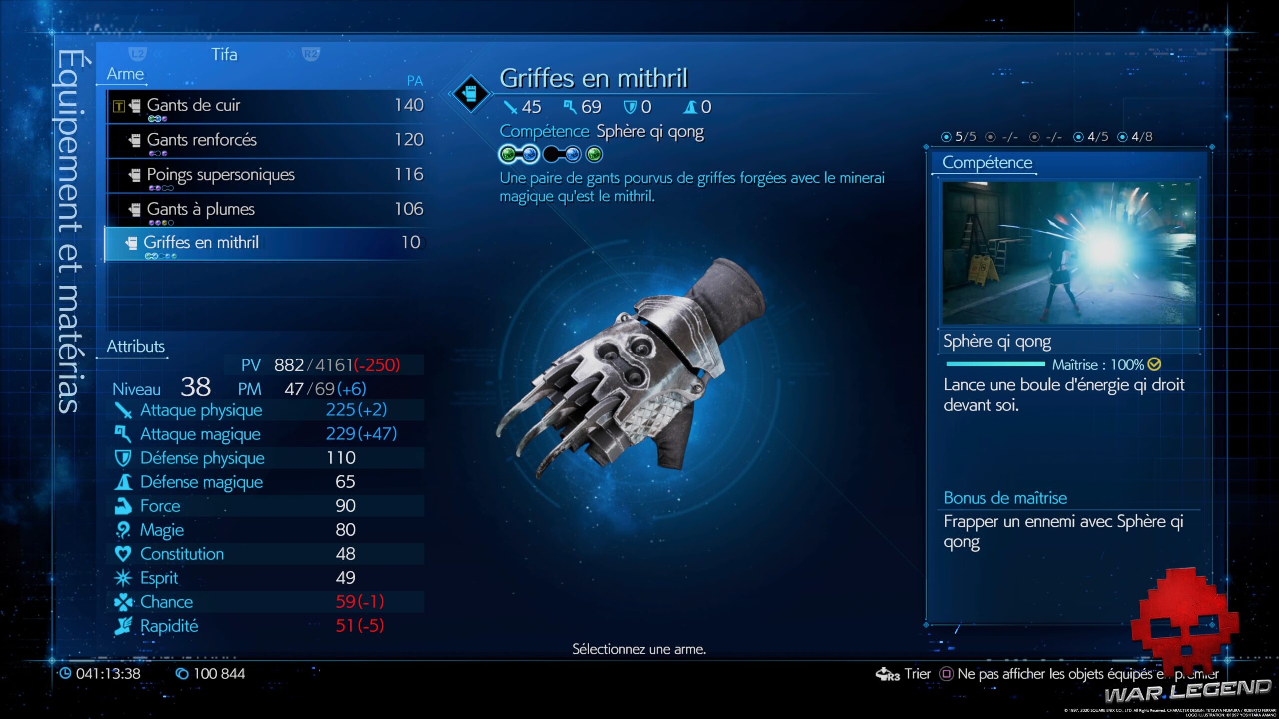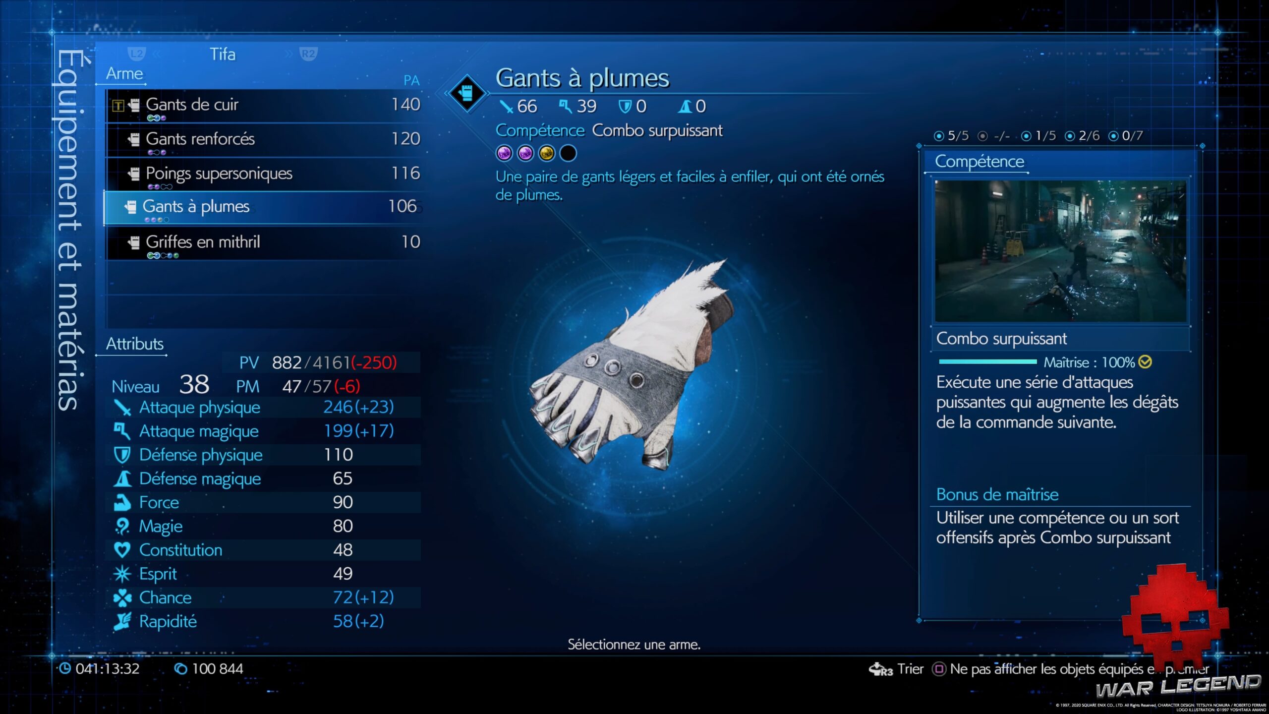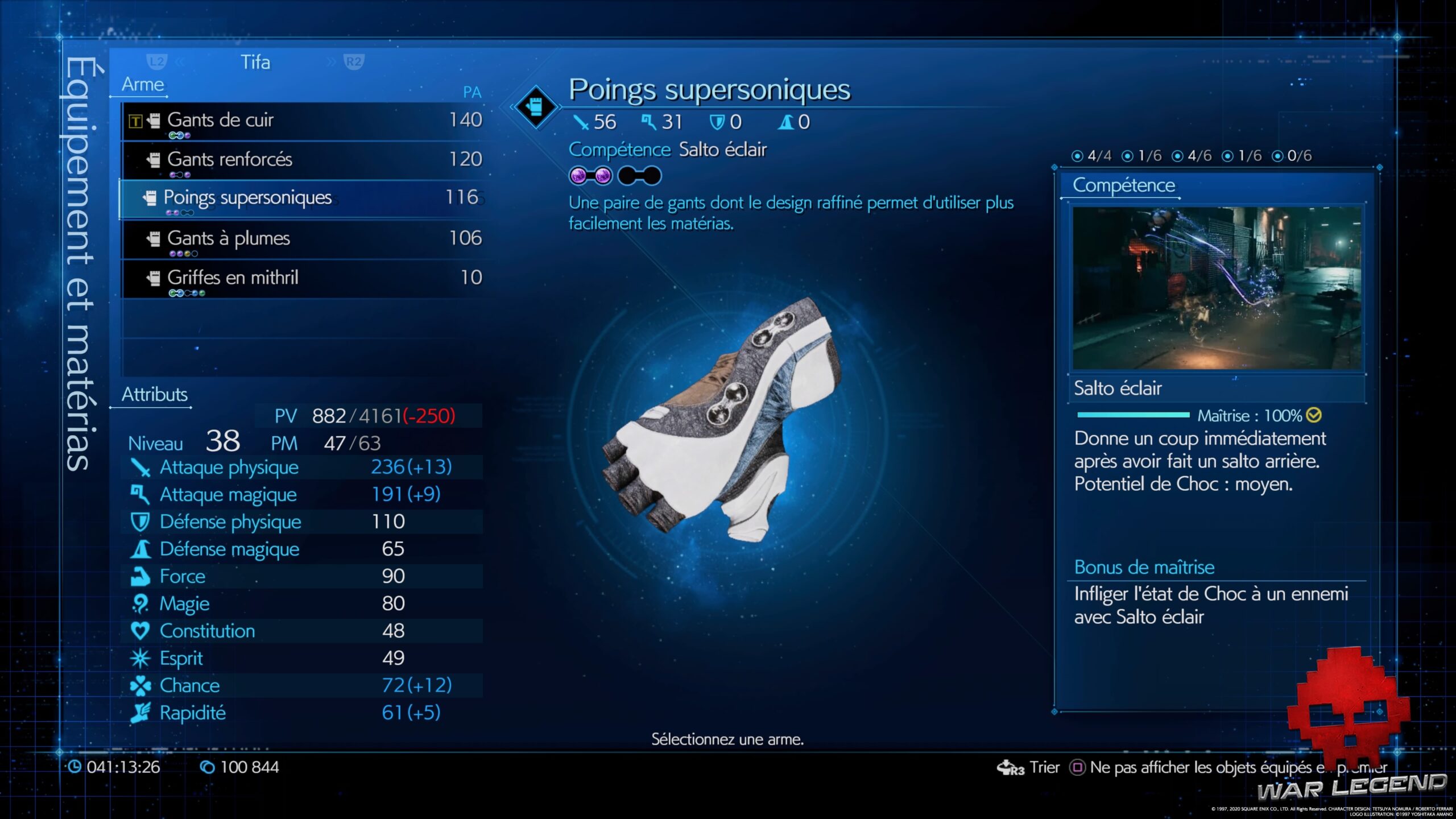 Assez bofs au premier abord, ces gants permettent à Tifa de gagner en vitesse de façon substantielle, avec Méditation Zangan qui a une chance d’activer Enseignements secrets lors du début d’un combat. Vous voudrez surtout débloquer Combo surpuissant au plus vite, qui fait énormément de dégâts.