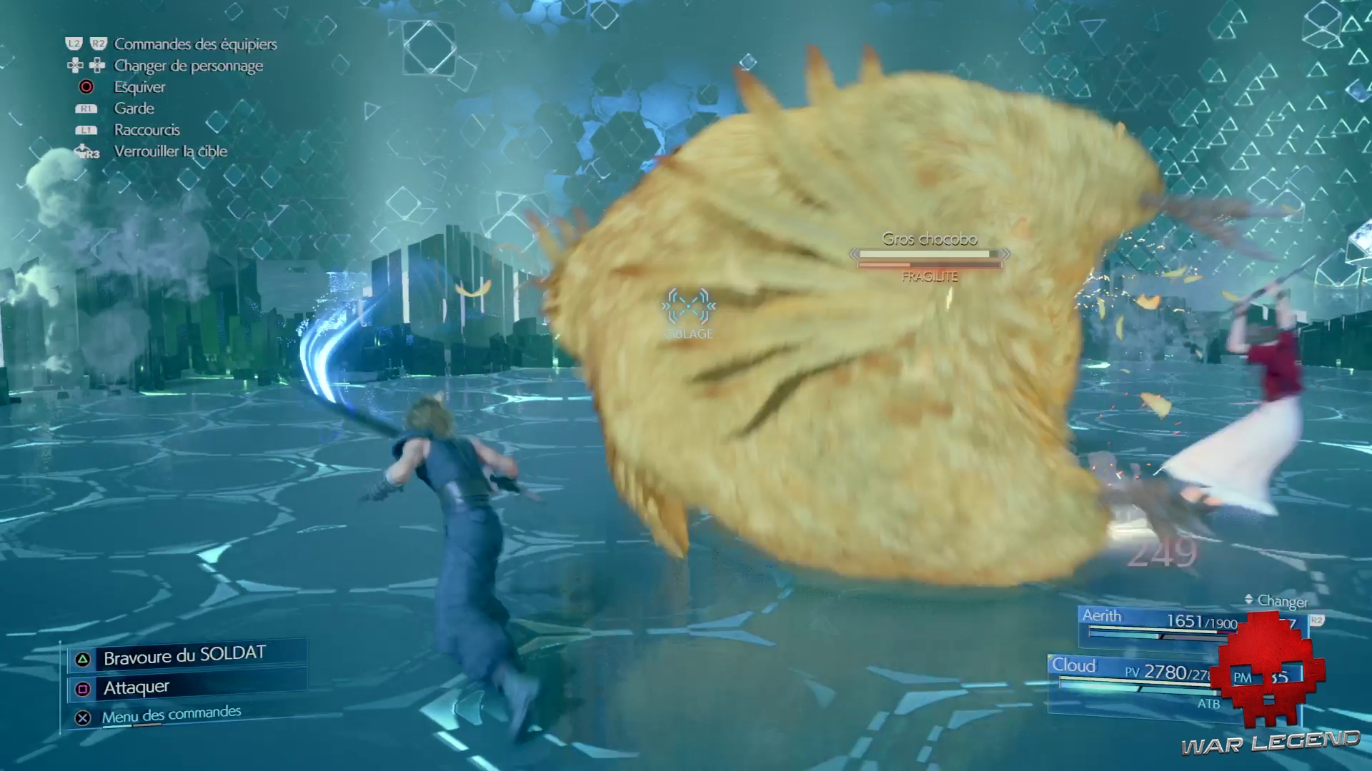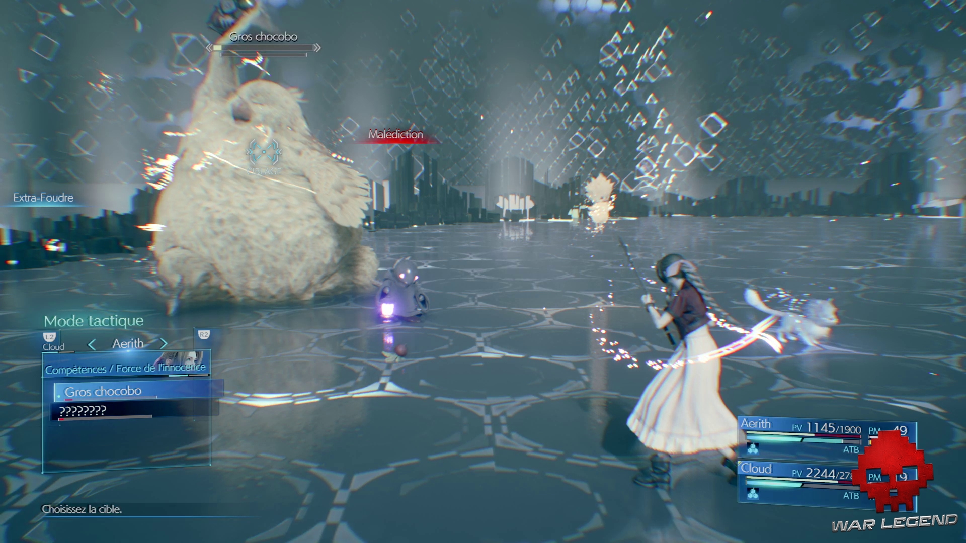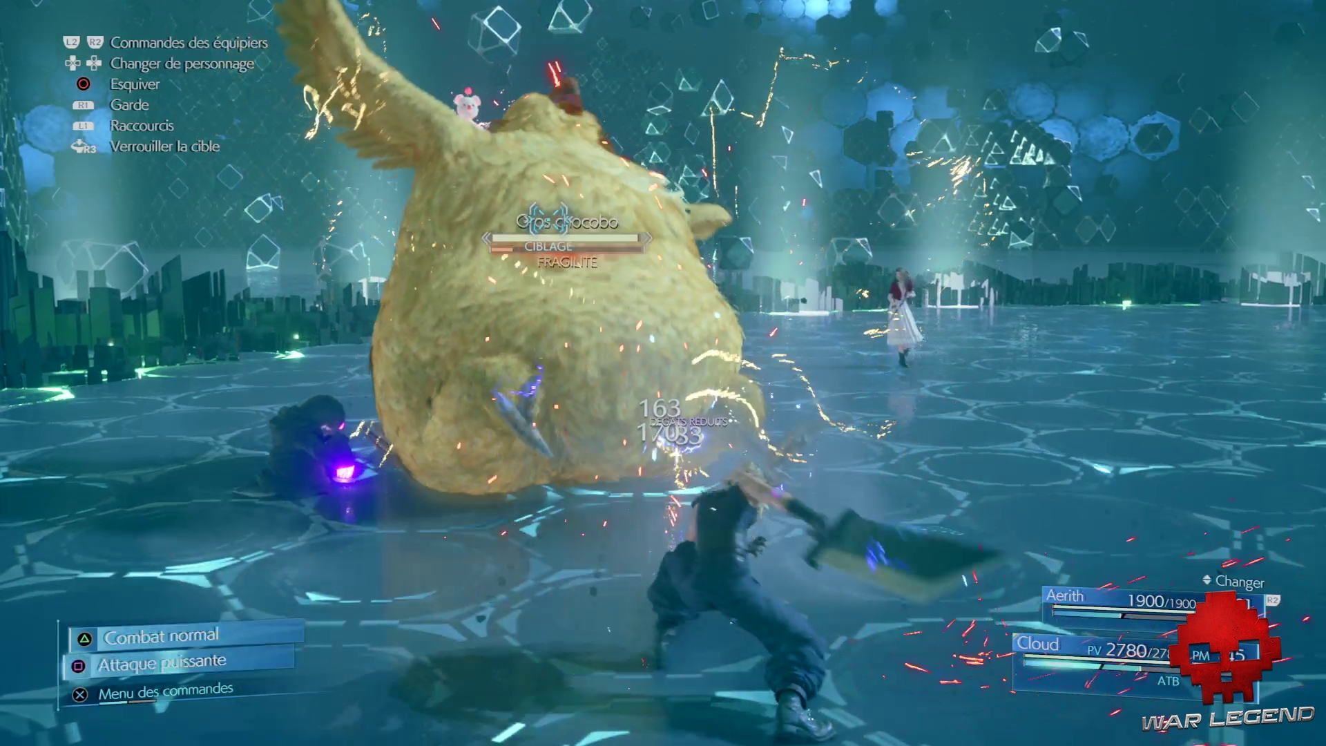 Le combat est plutôt facile, bien que la barre de vie du gros oiseau soit particulièrement pleine (comme lui). Il ne bouge pas beaucoup et la magie est particulièrement efficace sur sa barre de Choc (ce qui comprend l’attaque forte d’Aerith).