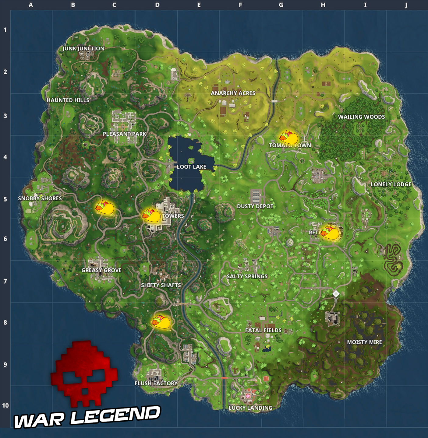 Il faut donc en visiter trois. Le plus simple serait de prévoir un itinéraire entre le terrain de foot à l’ouest de Tilted Towers, puis Tilted Towers (n’y sautez pas en début de partie), et entre Flush Factory et Shifty Shafts.