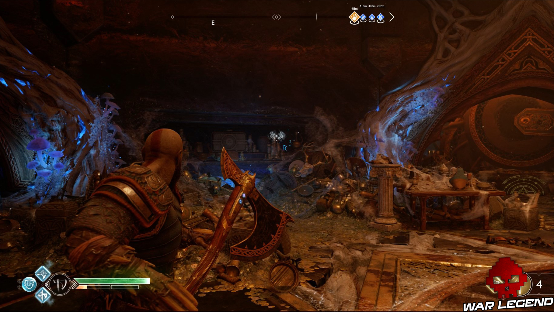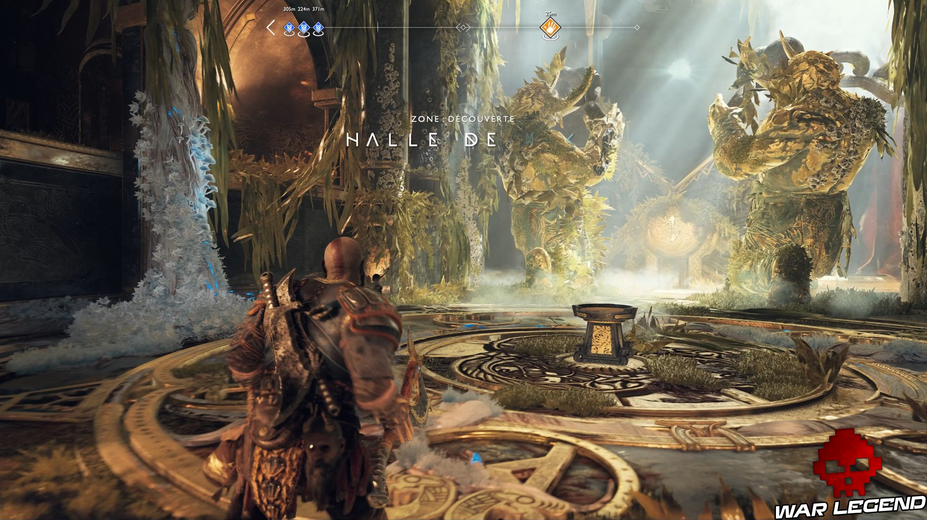 Face à la fresque des Jötnar, prenez la porte à gauche. Traversez la zone des piques puis, dans la nouvelle salle, prenez la première ouverture disponible en face à gauche. Traversez de nouveaux piques (faites sauter la grille sous le premier piège) et vous trouverez le coffre.
