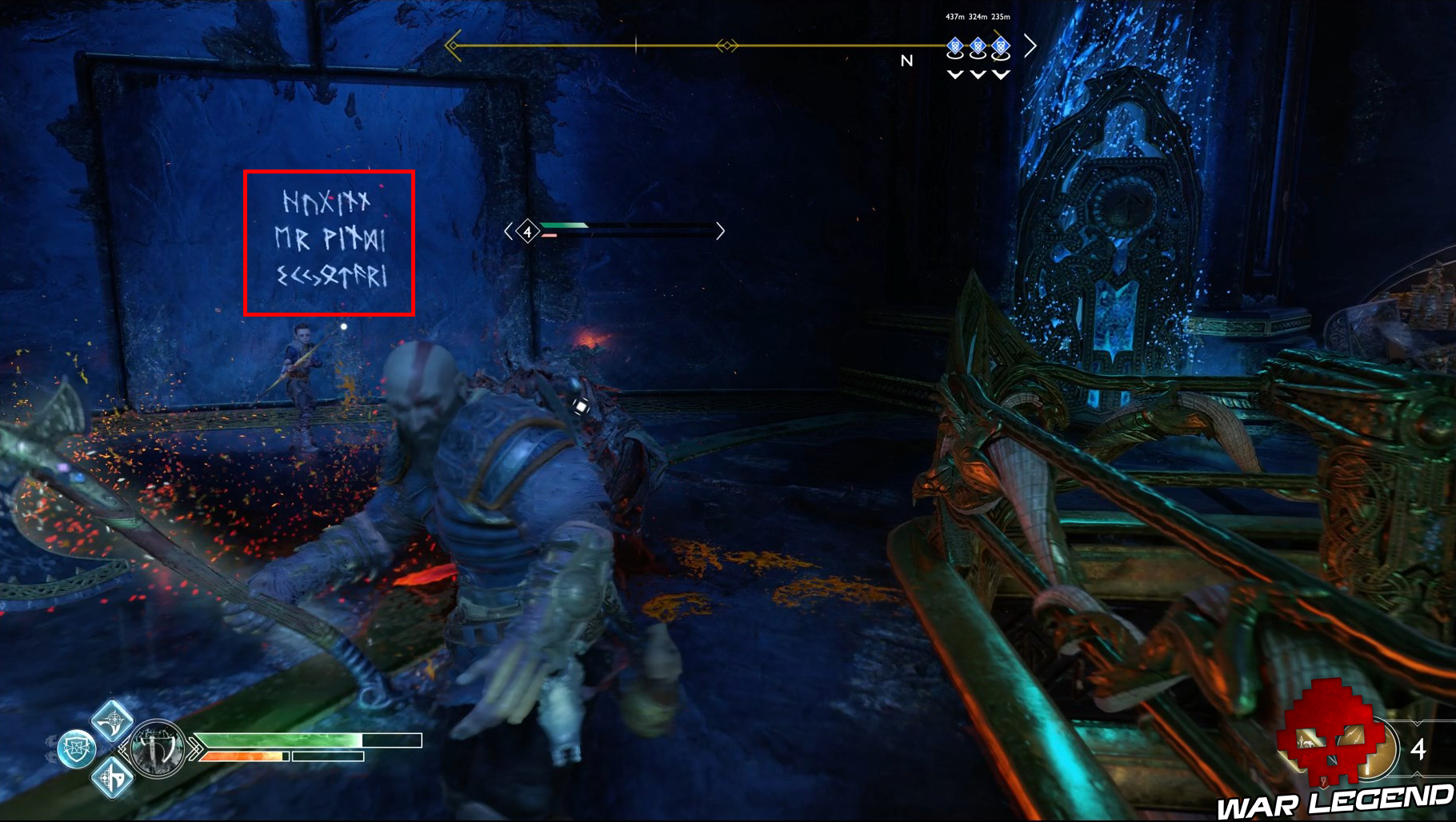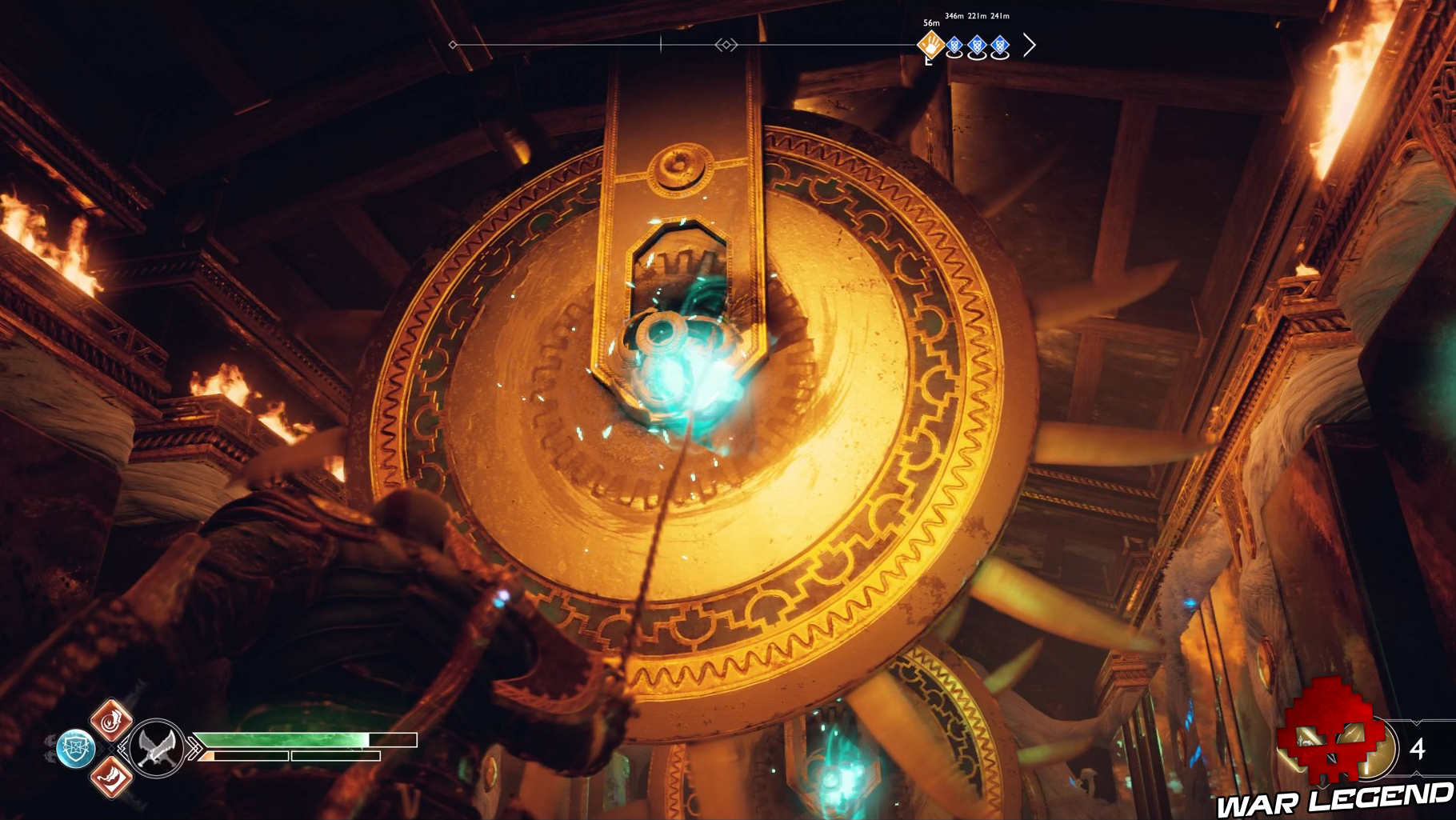 Face à la fresque, prenez la première porte à droite et, lorsque vous arrivez dans une salle avec une porte scellée par les « Vents de Hel », récupérez-en à proximité lorsqu’une scie circulaire se lève. Mettez-les dans le premier orbe, récupérez les seconds sur la deuxième scie et servez-vous de l’autre orbe pour ouvrir la porte.