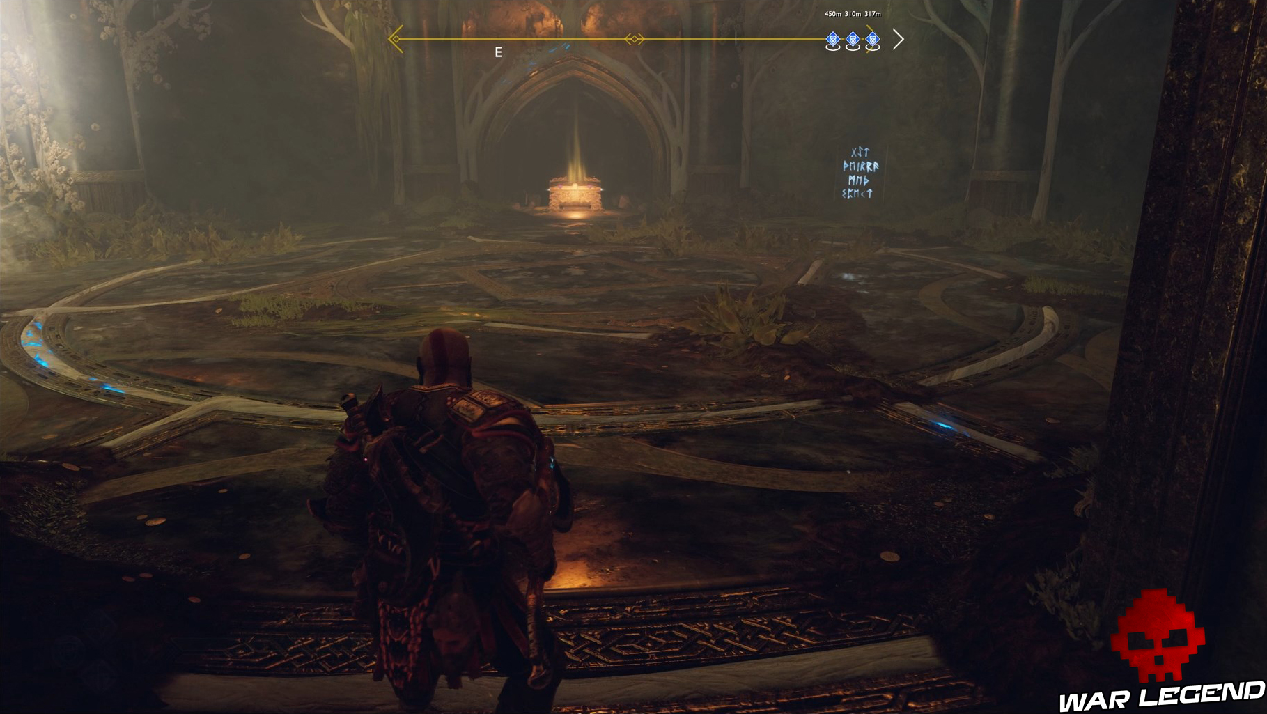 Une fois que vous êtes descendu dans le tombeau de Týr via l’ascenseur, avancez et tournez à gauche dans la grande salle.