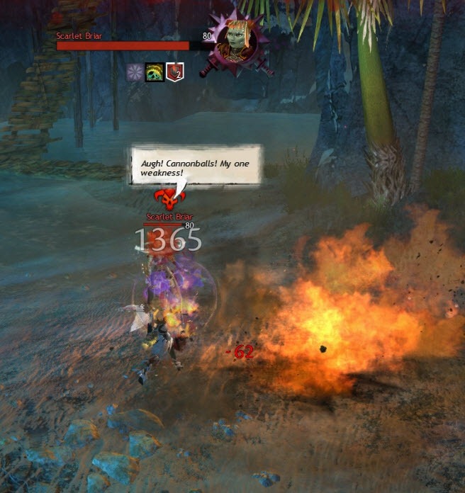 Scarlet Round 1Une fois que vous avez sauvé Faren, vous pouvez éviter tous les mobs et courir jusqu’au nouvel emplacement de Scarlet.Au début du combat contre Scarlet, faites bien attention aux cercles rouges sur le sol ou des boulets de canons tombent du ciel. Faites passer Scarlet dans ces cercles rouge pour la rendre vulnérable. Répetez cette étape quelques fois pour la tuer.