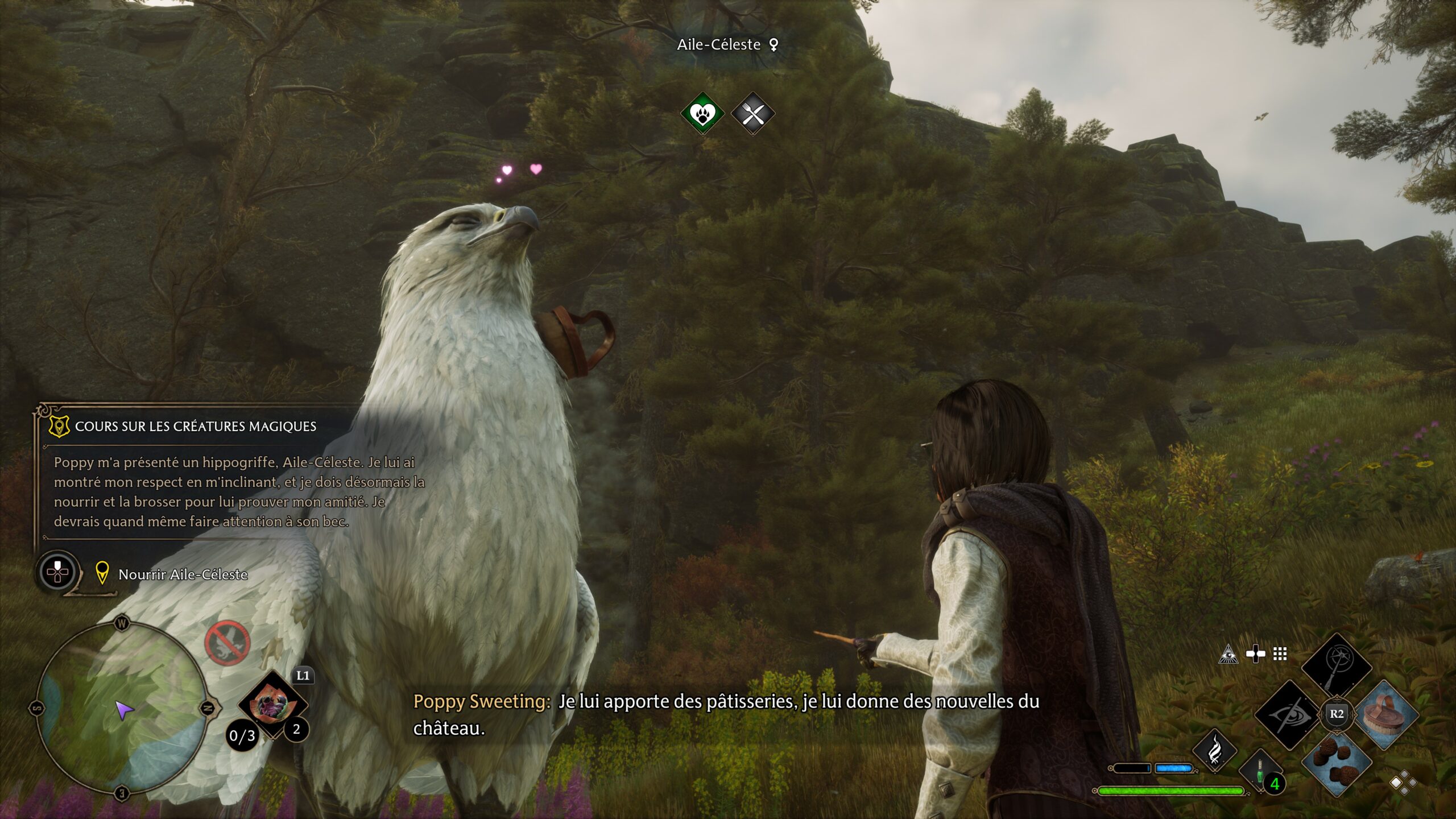 Après avoir accompli la quête principale « La première épreuve de Percival Rackham« , il vous est possible d’assister à un cours sur les créatures magiques. Vous apprendrez alors qu’il vous est possible d’en capturer pour le vivarium de la Salle sur demande, ce qui est un bon plan pour obtenir des ressources nécessaires à l’amélioration de votre équipement. Mais durant la quête, vous ferez aussi la connaissance d’Aile-Céleste, une belle Hippogriffe blanche.