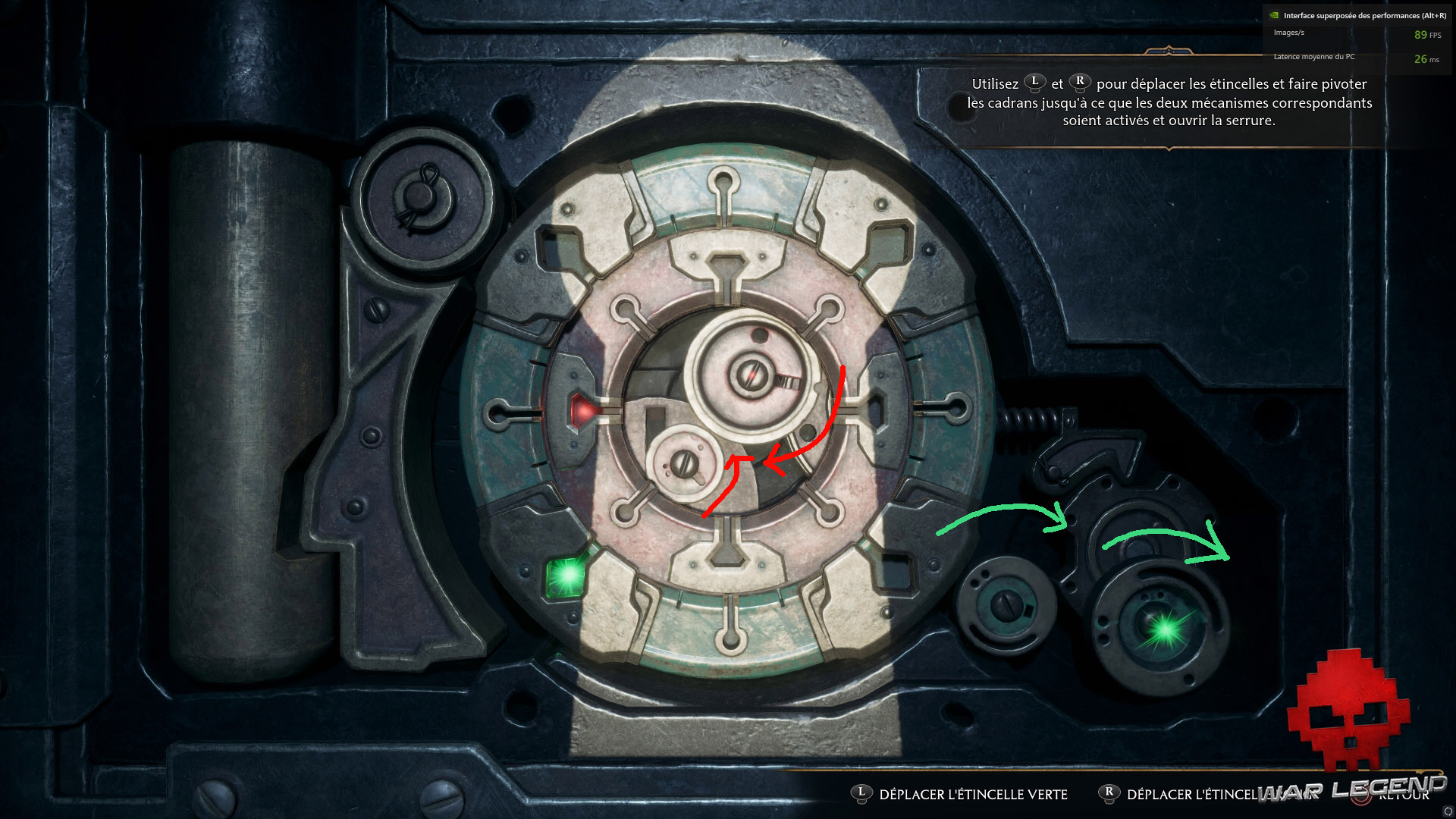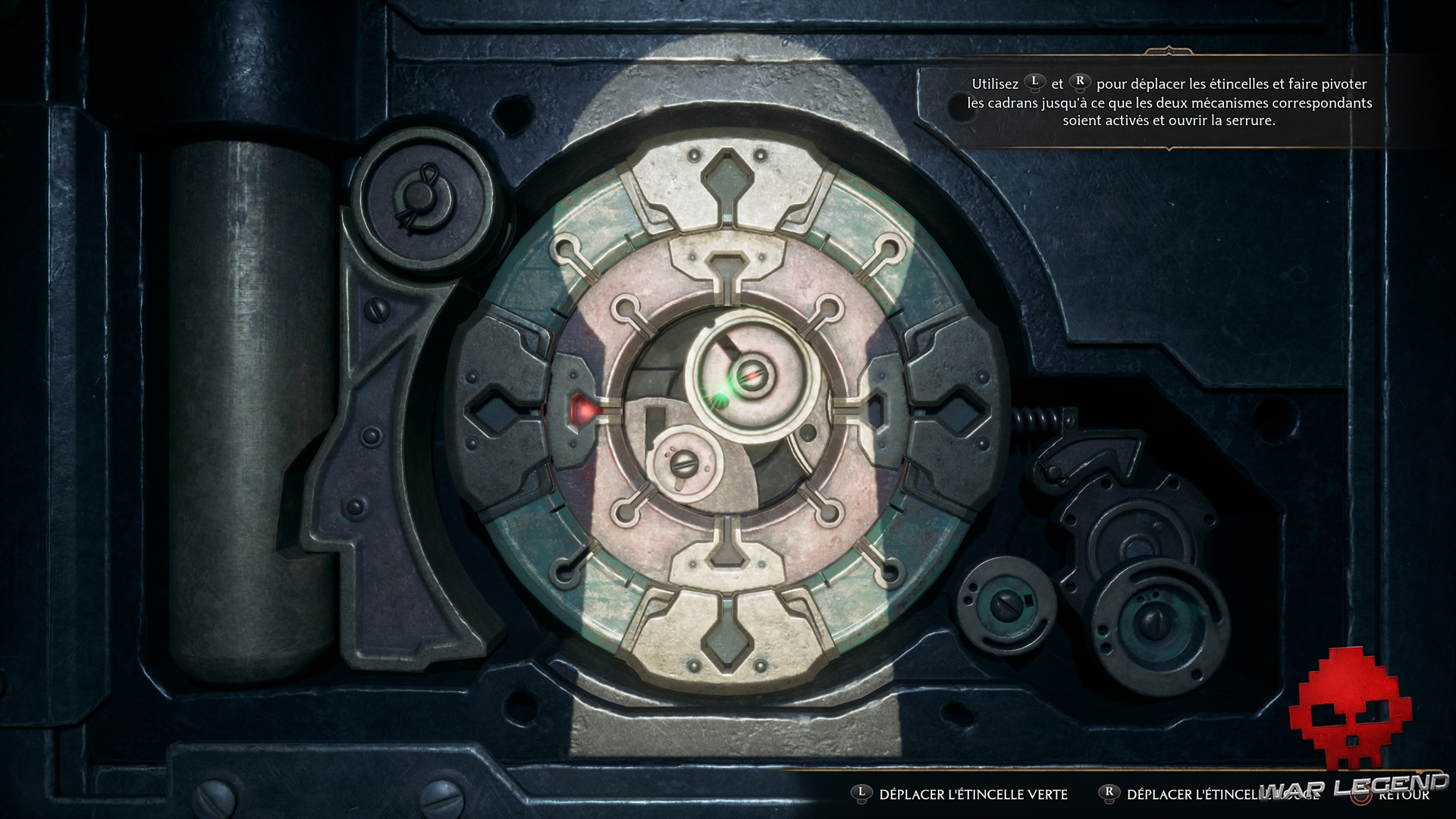 Chaque stick de la manette contrôle un des deux rouages de la serrure. Tournez individuellement chaque rouage pour trouver la position qui fait tourner le mécanisme associé (un au centre et un autre en bas à droite). Référez-vous aux petites lumières rouge et verte pour mieux comprendre qui fait bouger quoi.