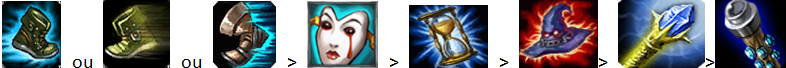 Explication : Ceci est le build classique, vous déroulez votre jeu, votre laning phase s’est bien passée, vous avez eu des kills et vous avez géré correctement vos phases de jeu. Il est donc logique que vous buildiez agressif, notez par ailleurs que vous avez un pool HP raisonnable + le zhonya en cas de coup dur. Les boots restent à adapter en fonction de votre opposant ou de la compo de la team. Les mercury si on affronte un AP/beaucoup de CC dans la team d’en face, les Tabi si vous affrontez un AD violent, et les Sorcerers si vous n’êtes pas inquiété. Ce build marche contre les AP ou les AD contre lesquels vous gagnez les trades.