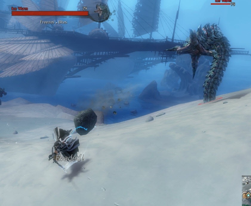 - Les Vers des Glaces dans le Détroit des Gorges Glacées, au sud de l’entrée du donjon de l’Honneur des Vagues – l’une de leur attaque est un jet de rochers qui peut être esquivé très facilement. Esquivez dès que vous voyez le rocher dans les airs si vous restez proches du ver.