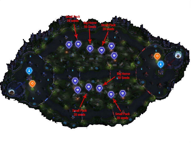 De chaque côté de la carte vous trouverez 2 camps de 3 horreurs nocturnes, qui offrent 20 graines, et une grande horreur qui permet de récolter 50 graines. Chaque côté offre donc 90 graines, et 180 graines sont récoltables par nuit.