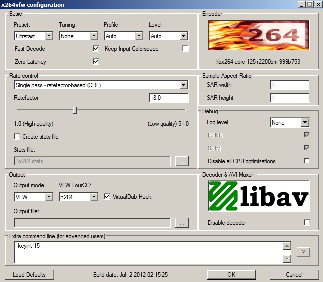 Ici je vous invite à mettre la même configuration que ci-dessous, ensuite si vous voulez une vidéo de meilleur qualité, vous pouvez baisser la barre ratefactor, mais attention cela puise alors plus sur les performances et les fichiers seront plus gros. Un bon mix se trouve entre 15 et 23. En Extra command line, le –keyint 15 est censé résoudre un bug qui empêchait l’édition des fichiers dans Sony Vegas.