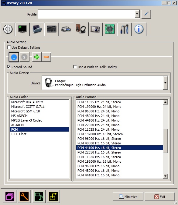 Configuration sonore ici, PCM 44100 Hz 16 Bit Stereo.