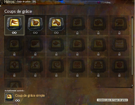 Les coups de grâce permanents peuvent être utilisés que ce soit en JcJ ou en McM. Ils sont disponibles dans la fenêtre Héros. Les coups de grâce gagnés en JcJ se débloquent toujours avec les rangs, mais il est maintenant possible d’en acheter des nouveaux dans la boutique aux gemmes. Il en viendra d’autres au fil du temps. Sélectionnez celui que vous voulez utiliser, vous pouvez en changer autant de fois que vous le souhaitez.