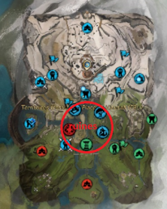 Les ruines se trouvent sur les territoires frontaliers, au centre de la carte. Il y en a 5 par map. Tenir 3 ruines dans un certain laps de temps confère un buff de soif de sang à tout le serveur. Astuce : Soif de sang permet d’augmenter toutes les stats des joueurs et les envahisseurs tués par un coup de grâce améliorent le score de guerre de votre royaume.