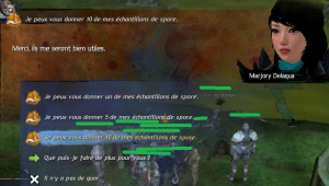 Apporter 50 échantillons de spores à Marjory au Camp de la Crête du Tonnerre. Rapporte 5 points. A la réalisation de ce succès, vous aurez aussi accès à un marchand qui vous vendra ses recettes contre des spores et de l’or.