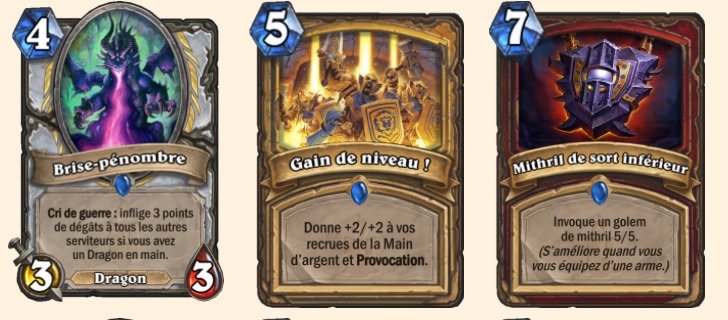 Renforcement du prêtre dragon souhaité par Blizzard avec le Brise-pénombre qui rajoute (encore) un sort de zone au prêtre. Gain de niveau semble montrer le souhait de Blizzard de remettre à jour les decks basés sur les Recrues de la main d’argent, une sorte de Tarim qui peut être rentable en synergie avec des cartes de Un’Goro par exemple. Et la mécanique de « sort » qui s’améliore sous certaine condition. On remarque que le sort ne devient rentable que si on l’améliore plusieurs fois.