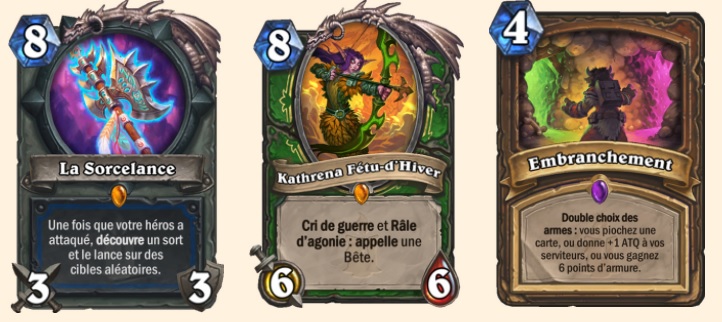 Nouvelle arme légendaire dévoilée, celle du Chaman. Assez déçu car donner autant de RNG (aléatoire) pour 8 mana… Cela rend la carte quasi injouable. La mécanique d’appel bien présente chez le chasseur avec une légendaire assez sympathique. On imagine bien ramener une Grande crinière et cette 6/6 pour 8 mana. Et enfin ajout du double choix des armes pour le druide. On ne peut que penser à la légendaire Fandral qui permettra de bénéficier de TOUT les choix en mêmes temps. Assez violent pour le coup!