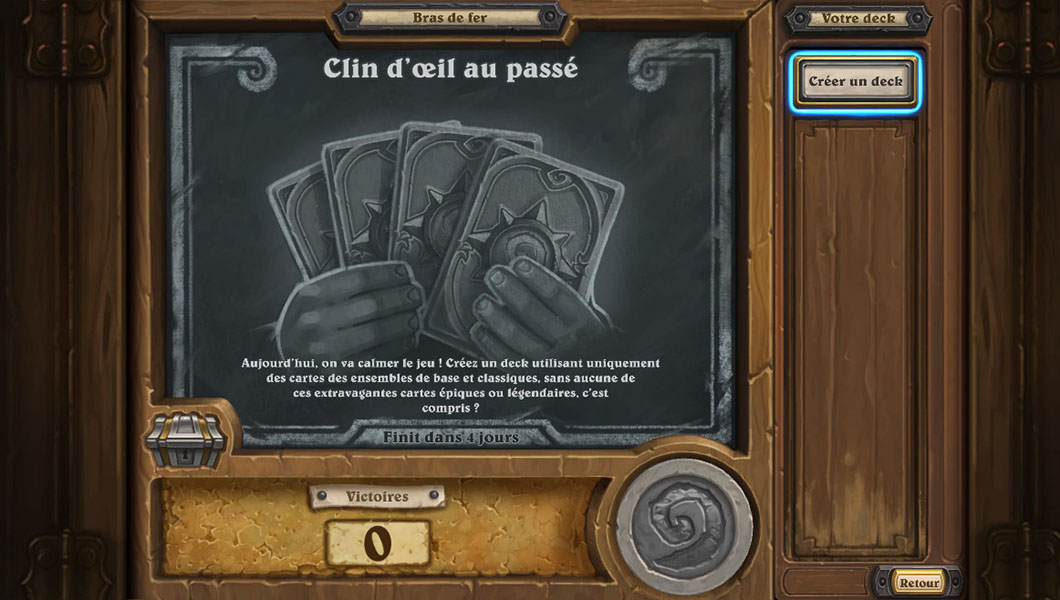 Cette semaine nous retrouvons un bras de fer qui nous propose de jouer avec seulement les cartes classiques (donc aucunes extensions) et aucune cartes épiques ou légendaires. On se retrouve à devoir construire soi même des anciens decks en mode low cost. De quoi se changer un peu les idées dans une méta bel et bien stabilisée. On regrettera peut être une suprématie du Chasseur mais vous pouvez retrouver d’autres decks ici.
