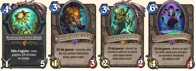 Zola la Gorgonne : Légendaire neutre rajoutant une copie d’un serviteur dans votre main, ça ouvre évidement à une multitude de combo/synergie. Une carte qui sera surement sous-estimée (comme Keleseth à sa sortie) mais qui a un réel potentiel.