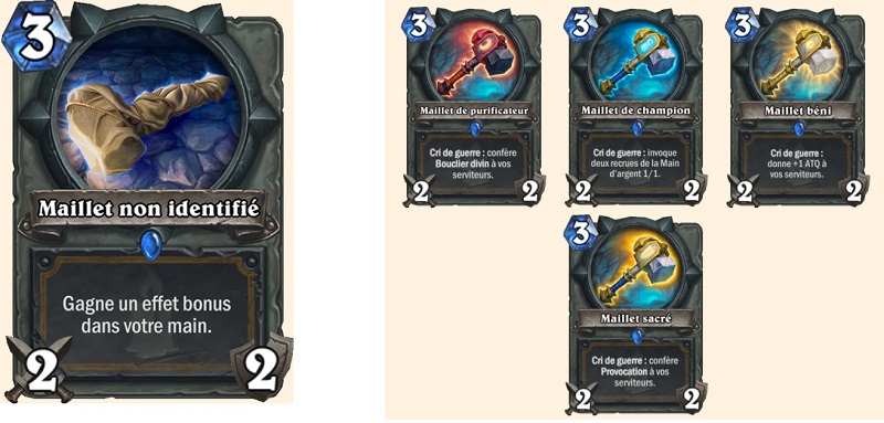 Maillet non identifié : Nouvelle arme pour le paladin qui bénéficie de la nouvelle mécanique qui consiste à gagner un effet quand vous piocher la carte. Effet choisi aléatoire parmi 4 choix possibles. Le soucis est que le paladin a déjà de bonnes armes et que le côté aléatoire rend cette arme un peu moins intéressante.
