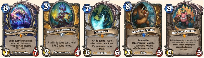 Temporus : Nouvelle légendaire pour le prêtre avec une mécanique assez marrante. En effet, vous donnez 2 tours à votre adversaire pour ensuite en récupérer 2 pour vous. Malheureusement, la carte a des stats assez faible et donner 2 tours à son adversaire revient à se suicider dans la plupart des cas. Un carte pour les decks fun au final.