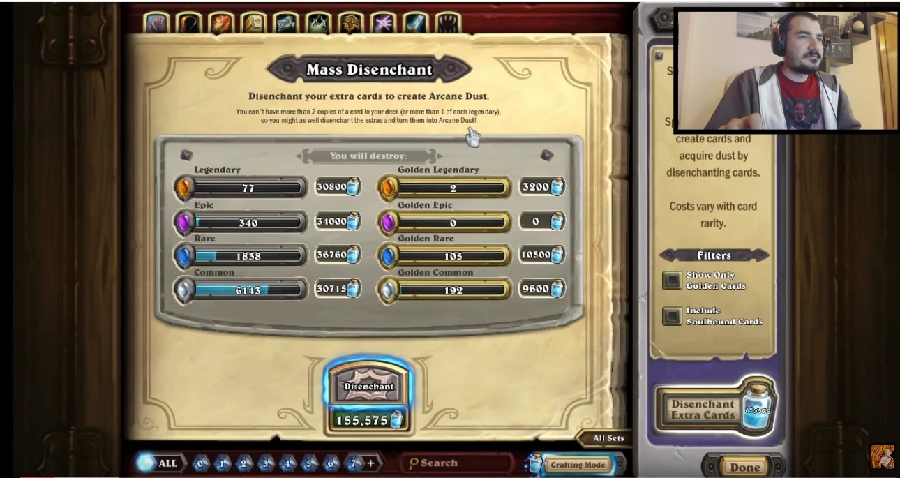 Le charismatique et enjoliveur Ben Brode responsable design sur Hearthstone depuis le début du jeu a confié ainsi que, environ à la date de sortie de la 2ème extension grand tournoi (ou TGT), le 24 août 2015 (les serveurs n’étant pas totalement stables à ce moment-là) un des joueurs, en la personne de Kriparrian, célèbre dans la communauté, possédait tellement de cartes en double que, s’il avait cliqué plusieurs fois sur le fameux bouton « désenchanter, » celui-ci aurait tout simplement fait planter le jeu !