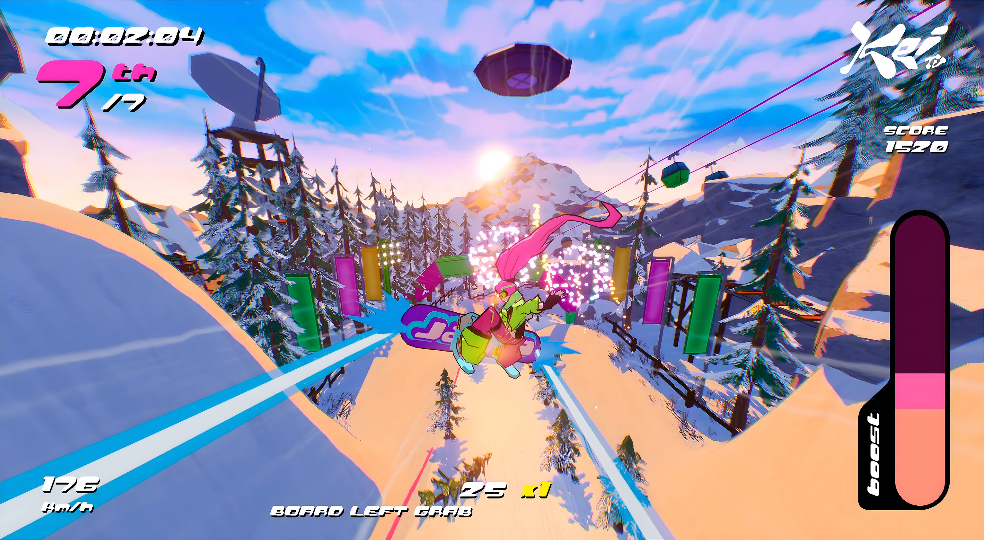 Les puristes remarqueront que les tricks ont encore l’air un poil lent par rapport à ceux de son modèle, mais avec ses couleurs flashy, ses tremplns et ses rails de grind éparpillés comme des miettes de croissant au pieu, HYPERYuki donne déjà sacrément envie de déflorer sa poudreuse. D’autant que non content de promettre la résurrection des jeux de snowboard typés arcade, le titre se paiera une bande-son composée par YMCK (un groupe de chiptune japonais), Trasto NueveVidas (un compositeur d’électro mexicain), et même Yusuke Yamauchi (compositeur qu’on retrouve sur Ace Combat et Tekken).