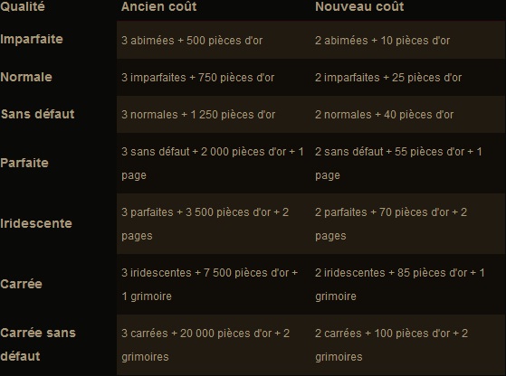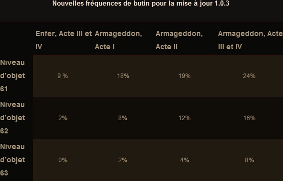 Passons maintenant à ce qui fait plaisir : – Le taux de level item drop augmenté en Hell et Inferno – Le coût des assemblages de gemmes « bas niveau » ainsi que le coût des crafts de forge ont étés revus a la baisse et ce de manière élevée.