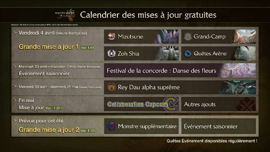 La bande-annonce confirme en outre que Capcom compte bien continuer à nous abreuver de quêtes événements en tout genre, histoire de retenir au maximum notre attention. D’ailleurs, le titre se parera même dorénavant d’événements saisonniers qui auront une influence sur l’apparence du Grand-Camp et des repas accessibles à la cantine. Des décorations de camp provisoire, des emotes et de l’équipement spécial pourront même être obtenus durant cette période qui débutera du 23 avril au 7 mai.