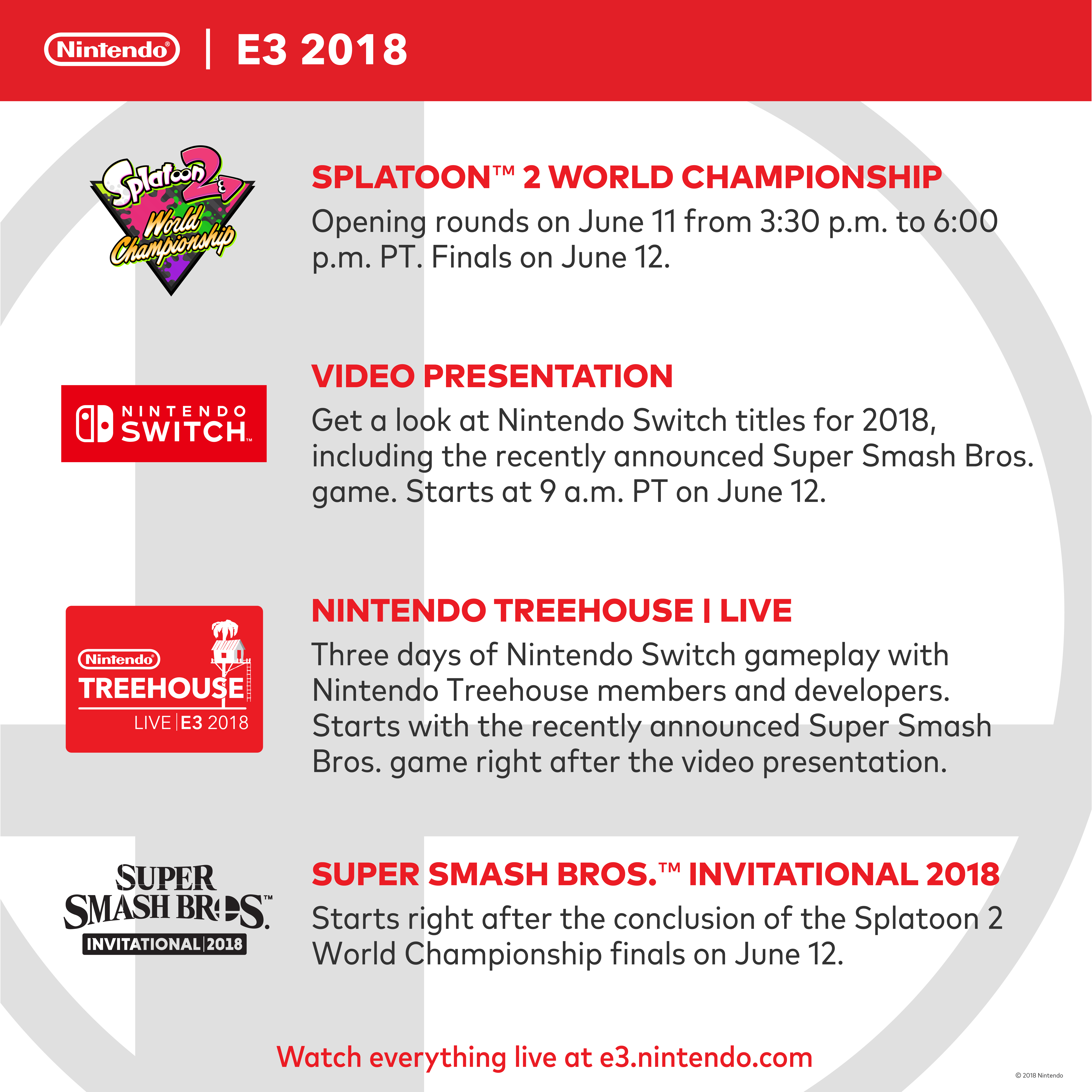 En plus d’héberger en parallèle le Championnat du monde de Splatoon 2 qui fera affronter les meilleures équipes américaines, européennes et d’Océanie, Nintendo Treehouse prendra le relais du Direct en revenant sur les annonces faites et en invitant une multitude de développeurs et de personnalités de la firme de Kyoto pour parler plus en profondeur de leurs jeux.