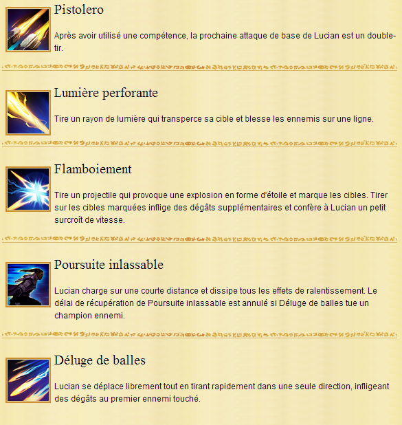 « DPS à distance très mobile, Lucian est capable d’infliger de gros dégâts aux ennemis qui s’approchent imprudemment. Lumière perforante confère à Lucian un véritable potentiel de harcèlement, même derrière les sbires, obligeant les carrys ennemis à choisir entre ne pas porter le coup fatal (pour esquiver les tirs) et subir des dégâts lorsqu’ils farment. Foncer avec Poursuite inlassable ou enchaîner Flamboiement et une attaque automatique sont de bons moyens pour Lucian de gagner le bonus de vitesse dont il a besoin pour rattraper et tuer les fuyards, ou bien pour échapper à un gank.Pistolero permet à Lucian de tirer rapidement deux fois de suite après avoir utilisé une de ses compétences. Cela offre au Purificateur de nombreuses occasions d’attaquer ses adversaires sur une voie et de prendre l’avantage lors des duels. Les effets à l’impact, comme le Vol de vie, les ralentissements ou le buff rouge, s’appliquent également deux fois, ce qui permet à Lucian de survivre encore plus facilement aux combats et de rester sur la voie.Déluge de balles, l’ultime de Lucian, est une compétence canalisée qui permet de tirer une véritable pluie de balles en ligne droite, infligeant des dégâts au premier champion ennemi touché. Contrairement à la plupart des compétences canalisées, Lucian peut charger avec Poursuite inlassable en même temps qu’il utilise Déluge de balles. Même quand Lucian se déplace, les tirs de Déluge de balles ne changent pas de direction après l’activation. Et il peut utiliser simultanément Poursuite inlassable pour fuir rapidement ou se rapprocher des ennemis en fuite. Tuer un champion ou obtenir une assistance avec Déluge de balles permet aussi de mettre fin au délai de récupération de Poursuite inlassable, Lucian pouvant ainsi devenir un tueur rapide et efficace tant que sont ultime est actif. »En Teamfight, Poursuite inlassable permet à Lucian de s’échapper rapidement lorsque les choses tournent mal et de kiter les adversaires qui le poursuivent ou encore de contourner les lignes ennemies pour se concentrer sur les cibles prioritaires. Lorsqu’il affronte un groupe d’ennemis, les marquer avec Flamboiement lui permet d’avoir de nombreuses cibles sur lesquelles profiter d’un bonus de vitesse, tandis que Lumière perforante transperce tout le groupe.