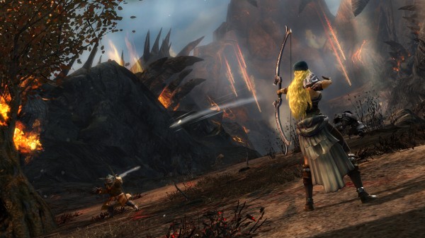 Chaque fois que nous implémentons un nouveau système, il y a à peu près 1000 décisions qui doivent être prises directement, et 1000 autres que vous ne faîtes pas dès le début. Les plus grandes décisions sont prises arbitrairement par le joueur, c’est-à-dire VOUS ! Nous voulons que tout le monde étant dans la même équipe dans Guild Wars 2 soit vraiment dans la même équipe – sans se battre pour les ressources, sans avoir des motivations contradictoires, sans minimiser l’expérience de chacun. Ceci nous a menés à des choses telles que le système de combo, qui vous donne une raison d’être excité à l’idée de vous battre aux côtés des autres car vous combinez vos attaques avec les leurs de différentes manières stratégiques. Chaque joueur peut récolter chaque ressource car nous ne voulions pas qu’il y ait de tensions croissantes dans un groupe essayant de s’aventurer ensemble dans un même endroit. Les évènements eux-mêmes existent parce qu’ils sont le contenu type qui tire avantage d’un grand nombre de joueurs présents dans le monde. Même la manière dont nous récompensons la participation aux évènements est faite en sorte que votre contribution importe, mais pas aux dépens de quelqu’un d’autre.