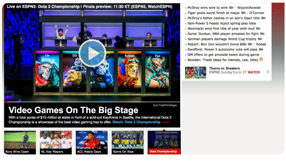 Autre fait marquant et pour la première fois, ESPN a décidé de retransmettre en direct l’International 2014. Cette diffusion sur le plus gros média sportif au monde revêt un caractère symbolique fort.