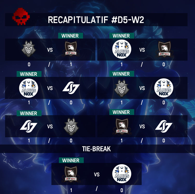C’est donc Rox Tigers qui termine premier de cette phase de groupe et Albus Nox Luna deuxième. Gamers2 et Counter Logic Gaming sont donc éliminés.
