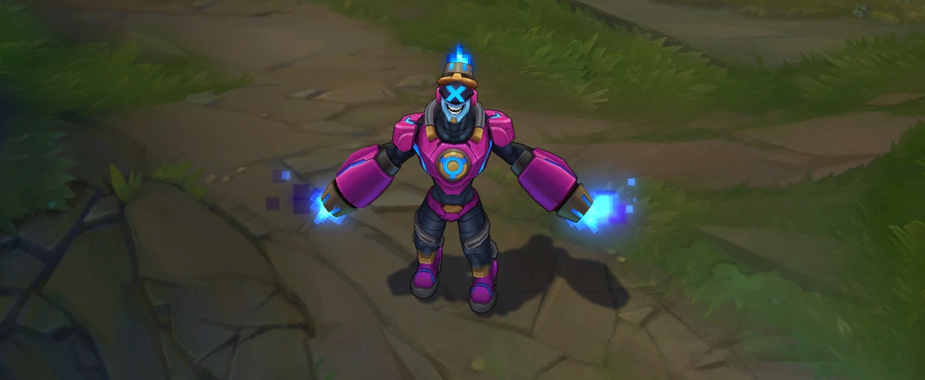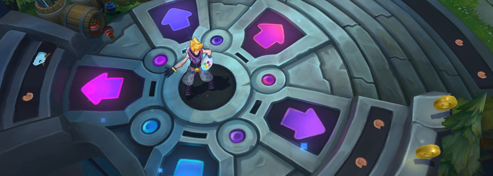 Bien qu’on ne soit pas au niveau de la carte de Noël ou même la Lune de sang, Riot nous a concocté une faille disposant de bâtiments et de quelques décors sous le thème arcade. Comme le veut l’adage des skins à thèmes, ces derniers sont également accompagnés de skin de balises.