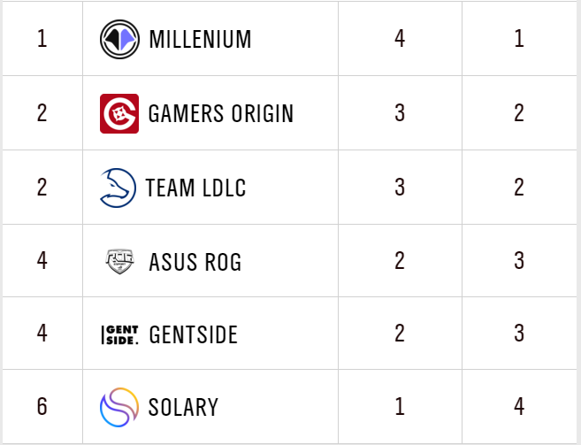 Alors que l’équipe LDLC était tenue favorite dans les pronostics, c’est Millenium qui domine le tournoi dans cette première semaine alors que LDLC est au coude-à-coude avec GO. Pour rappel, l’équipe LDLC a opéré des changements de roster importants (avec notamment l’intégration de YellOwStar en tant que coach après son départ du PSG eSports), affichant clairement son ambition de terminer première du tournoi.