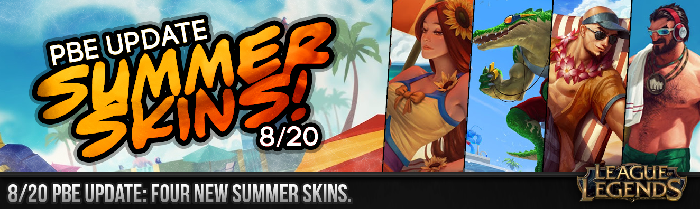 Hier, le PBE a été update et un nouveau contenu est donc en test: ici l’été et les vacances ( pour ce qu’il en reste !) sont bien entendu mis à l’honneur et ce sont quatre de nos champions favoris qui enfilent les maillots!