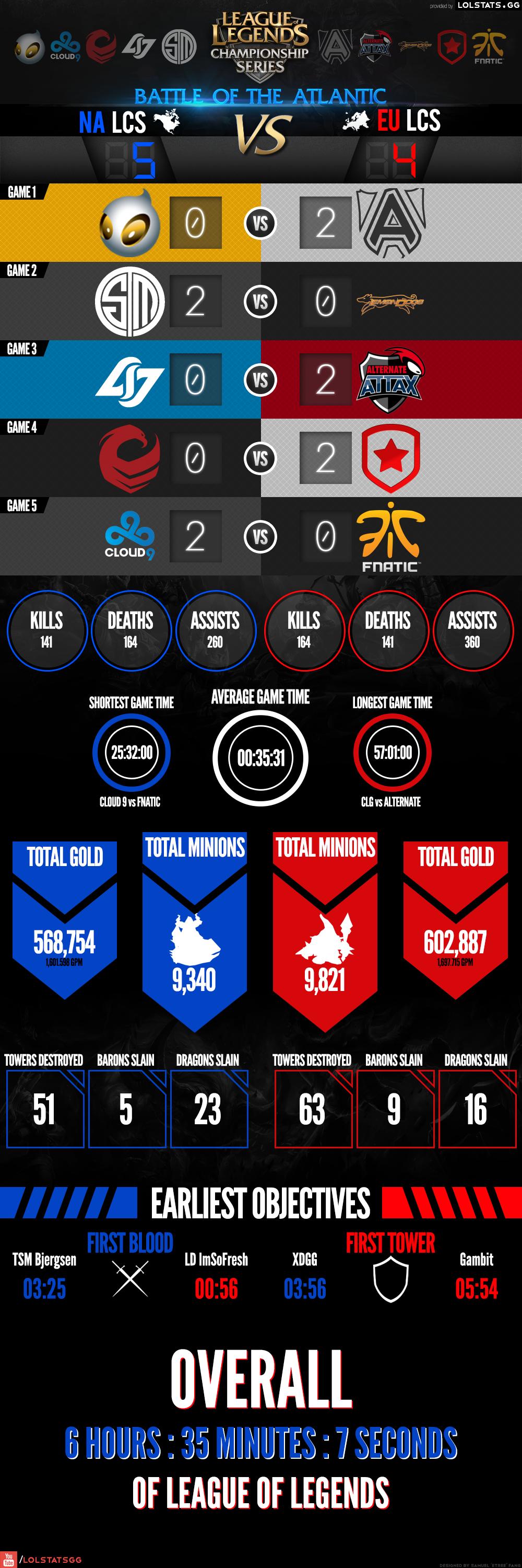 Les matchs opposant les européens aux américains ont pris fin hier par la victoire des Cloud9 ! Ce qui entraîne le titre honorifique de meilleur région des LCS aux américains car malgré le fait que les européens ont gagné 3 matchs sur 5, leur nombre de points totalisés est inférieurs.