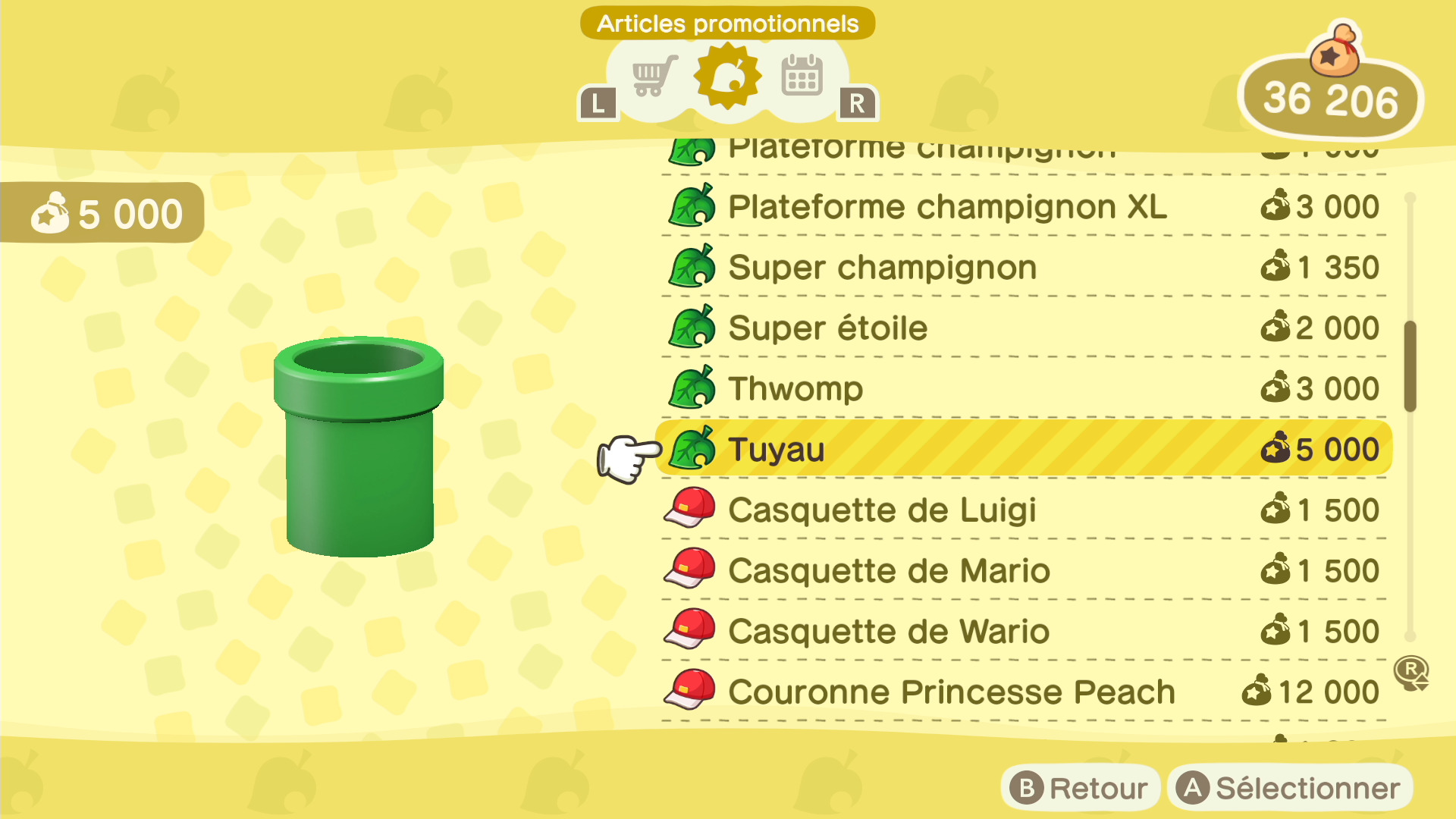 Ces divers articles sont disponibles au bureau des résidents, dans « Nook Shopping » puis dans « Articles promotionnels », ou alors par l’intermédiaire de votre NookPhone — adieu les clochettes —. Vous avez notamment la possibilité d’acheter le tuyau vert qui peut vous permettre de vous téléporter d’un bout à l’autre de votre île.